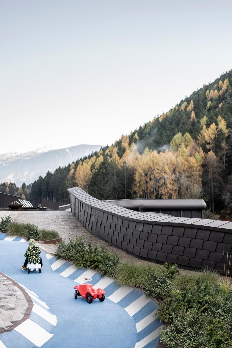 Throughout the entire complex, recreational spaces are interspersed with green areas that create continuity with the forests in the valley. “We literally brought nature up to the roof,” Andreas Profanter remarks. “The aim was to strengthen the link between the building and the landscape, without taking up any more land, but rather by creating added value and a new way of thinking about sustainability”.