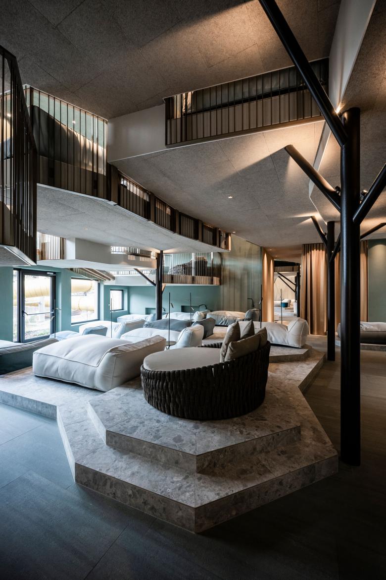 It is a historic hotel, the first to be opened by the Falkensteiner family, which today runs a group of more than 30 hospitality properties across 6 countries. Established in 1957 on the edge of the village on the shores of a small lake, the family resort has gradually expanded to cater for a clearly defined target group, that of families with children. The aim of the project was to add new spaces and functionalities that would reinforce this vocation, creating a kind of playground for the little guests and, at the same time, a place where parents could relax. A defining point of the project was also the beautiful Alpine surroundings, in which the hotel complex was meant to blend in harmoniously.