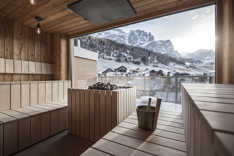 Various lounges and restaurants can be found on the ground floor, always following the alternating natural landscape of the Badia Valley: furniture and sofas in blue, green and brown tones suggest alpine meadows, biotopes, moss forests or rock caves. From the “Base Station” - the reception with gondola – takes you up to the “hut cabins” (rooms & suites), further over the rocks to the summit of snow and ice creating the relaxation area with a view of the Dolomites. The natural experience becomes the main theme of the entire design.