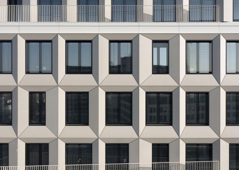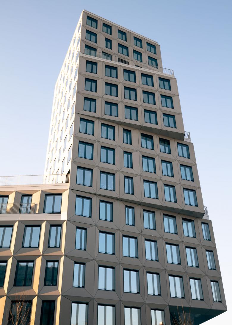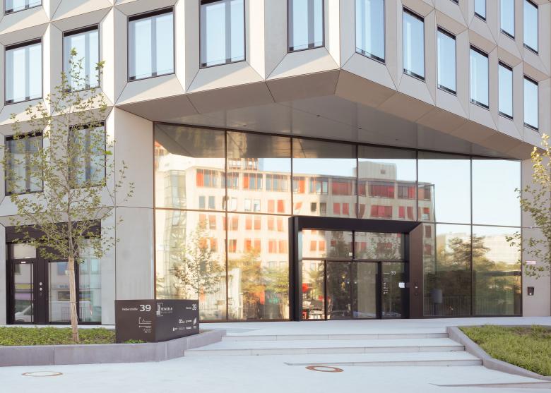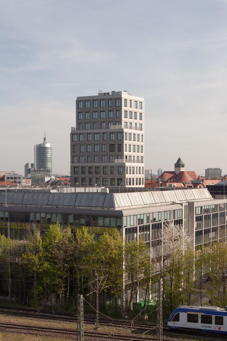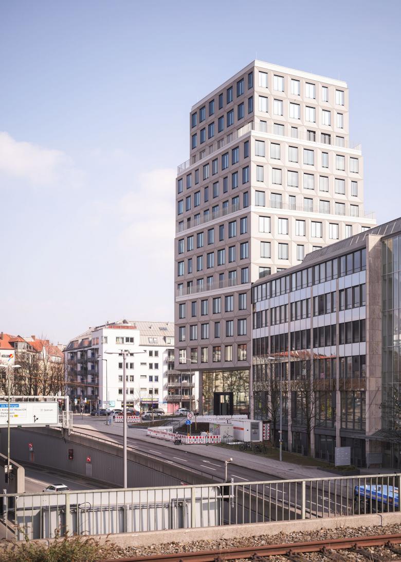 The existing ensemble on the corner plot comprises three building sections that are used for office structures. The existing building on Garmischer Strasse was integrated into the redesign. New designs have been created for the high-rise building and the adjacent office building, which take up the special features of the location as the intersection of one of Munich's most important traffic axes. The most striking structure of the ensemble is the high-rise building across the corner, which, in addition to the basement, accommodates an additional 13 standard storeys and, with its height of almost 50 meters, lends the entire complex an emphatic presence in the cityscape. From the perspective of Garmischer Strasse, the high-rise building is stepped upwards. From the perspective of Heimeranplatz, the structure, consisting of three or four-storey cubes, is shifted around the axis of the vertical architecture. The rotation of the building masses as an architectural interpretation of the movement on the site also creates a young and lively silhouette.