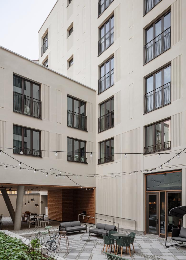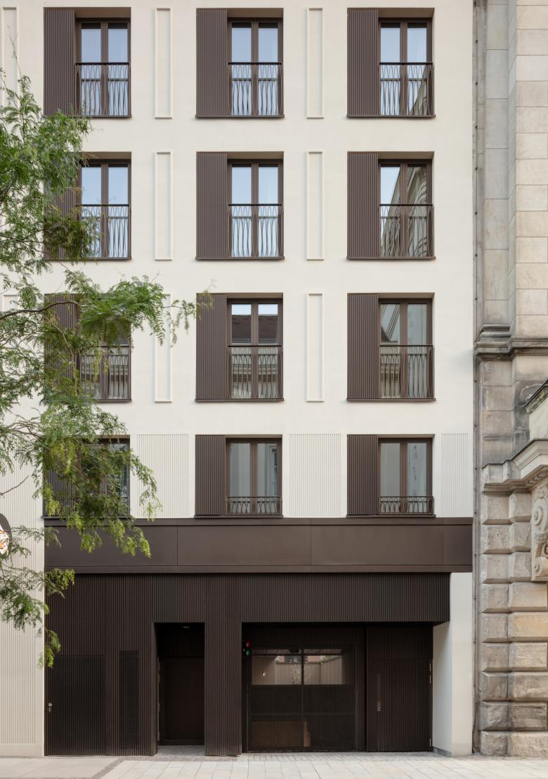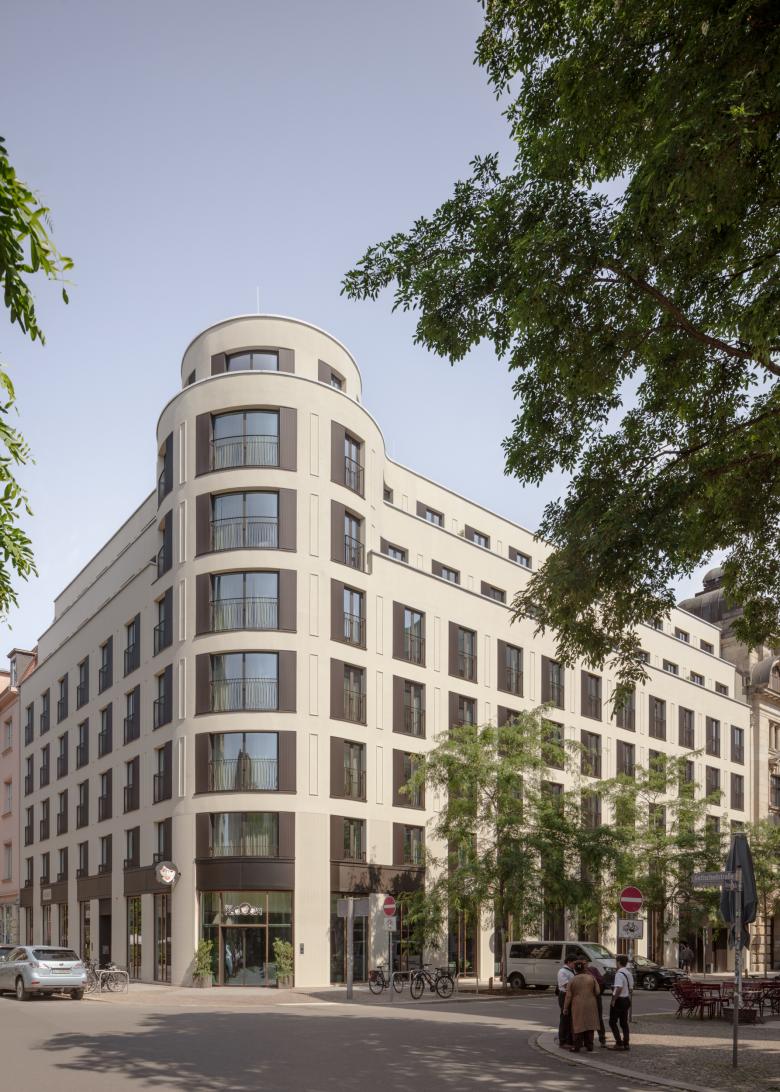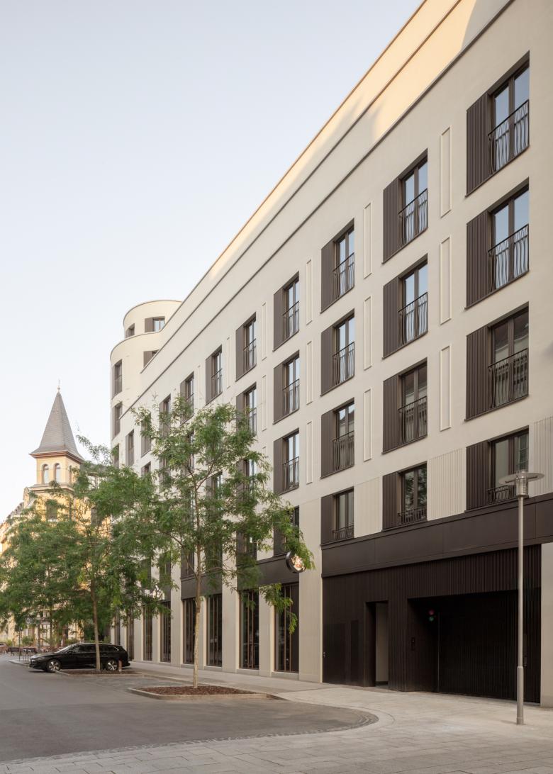 The façade design of our new hotel building is inspired by the aesthetics of the early 20th century, which still characterizes some of the surrounding architecture today. The plaster façade, whose color scheme is based on the surrounding architecture, is structured by classical decorative elements. Horizontal bronze friezes adorn the parapet above the first floor, followed by vertical, narrower plaster embossing up to the staggered storeys. In the area of the flanks, the window arrangement is uniform with narrow double-sash windows; in the area of the corner of Gottschedstrasse and Bosestrasse, the window area is enlarged over the five full storeys to emphasize the corner formation and anchor it visually in the urban space.