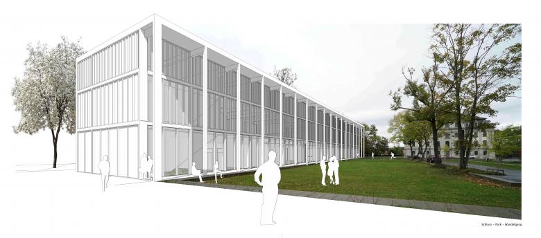 Der nächste Neubau zum Lehren, Lernen und Forschen an der Dualen Hochschule Gera-Eisenach fügt sich als Seitenflügel zum vormaligen Wasserschloß Tinz. Der langgestreckte Baukörper nutzt dabei das sehr beschränkte Grundstück so aus, dass eine rahmende Wirkung entlang der historischen Wasserlinie nachgezeichnet wird, der Neubau in Höhe und Dimension sowie architektonischer Zurückhaltung die dem barocken Hauptgebäude angemessene Präsenz unterstreicht und gleichermaßen dessen architektonische Ordnungsprinzipien in zeitgemäßer Weise übersetzt - zur eigenen Wirksamkeit als auch in Korrespondenz zur Umgebung.