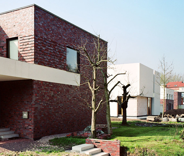 Wohnen, Wasser, Wartburgblick – Entgegen der anhaltenden Zersiedelung der Stadtränder mit Einfamilienhausstrukturen, haben wir ein innerstädtisches Grundstück gesucht, das bis dato als Bauland ungeeignet erschien, um familienfreundliches, modernes, individuelles Wohnen in der Innenstadt zu initialisieren. Für die zentrumsnahe Fläche zwischen Stadt und Fluss, wurde eine Parzellierung und Haustypologie entwickelt, die sich bausteinartig zusammenfügt und ergänzt. Die Tradition der modernen Wohnarchitektur der 30-er Jahre diente als Vorbild für eine zeitgemäße Interpretation des klassischen Einfamilienhauses im Zentrum der Stadt. Beispielhaft für die kleine Siedlung stehen Wohnhaus B. (110 qm Wohnfläche), Wohnhaus F. (150 qm Wohnfläche) und Wohnhaus A. (145 qm Wohnfläche). Kubaturen und Materialien als gestaltprägende und -verbindende Elemente der individuell geplanten Häuser korrespondieren mit den Industriedenkmälern des ehemaligen Automobilwerkes der Nachbarschaft.