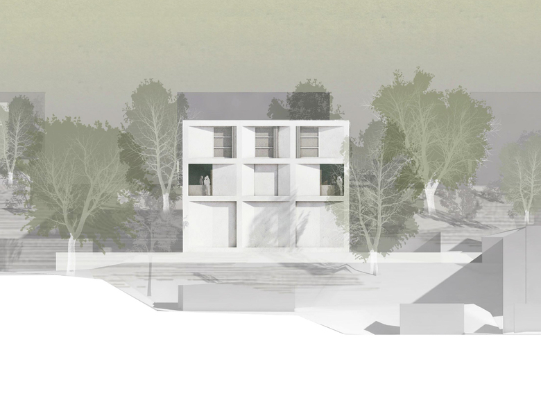 Gleichzeitig eröffnet das Ideal des Würfels neben seinem optimalen Flächen-Volumen- Verhältnis eine effektive zentrale Raumorganisation. Nach einer vorgabegemäßen funktional-technischen Anbindung des Targetraumes als unterirdischen Verbinder zum Fröbelstieg 3 baut sich über dem Kellergeschoß mit den Technikflächen eine Stahlbetonskelettkonstruktion im Raster auf. Das Erdgeschoss auf Hangebene nimmt die Laborräume auf, die hierdurch transporttechnisch gesondert erschlossen werden können. Das 1. Obergeschoss entspricht dem Niveau der Fraunhoferstraße, so dass die Haupterschließung hier durch eine Brücke nach Norden eingerichtet wird. Dementsprechend nimmt das Geschoss im Wesentlichen erste Büros und den Seminarraum auf, der teilbar und in Raummaximierung angeboten wird. Im 2. Obergeschoss werden für die weiteren Büronutzungen organisiert. Die gewählte Konstruktion erlaubt langfristig räumliche Flexibilität, Anpassungen oder auch Umbauten. Die Fassade erlaubt gleiches. Zunächst gibt sie der Grundstruktur Ausdruck. Plastische Einschnitte bilden die Raumstruktur und letztlich das Raster ab und legen ein Spiel von Licht und Schatten auf der Oberfläche an. Als nächstes werden „Durchstoßpunkte“ im Relief der Außenhülle so angelegt, dass sie eine Entsprechung zur Funktionsbelegung haben: es entstehen Fenster, Zugänge und freie Öffnungen, die auch Loggien aufnehmen und so im Grundsatz Korrespondenzen zwischen Innen und Außen erzeugt werden, die in der allumfassenden Behandlung des Würfels als symbolischer Themenbezug zum Helmholtzinstitut hinsichtlich Wechselwirkung zwischen Licht und Materie gelesen werden können. Die Erscheinung der Fassaden ist wandelbar durch die Lichtverhältnisse, Schattenbildung in den Wandnischen, auch durch die Baumschatten; nicht zuletzt durch die Verschattungselemente, die die Fenster zur geschlossenen Fläche verwandeln und ggf. künftig auch durch potentiell weitere Fenster im Erdgeschoss.