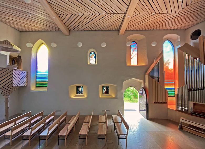 Das Zusammenspiel der Farben und Materialien für Boden, Wand und Decke aus Eschenholz, Muschelkalk und Kalkputz unterstützt in seiner Helligkeit und Natürlichkeit die sakrale Raumwirkung im Gleichnis zum Licht und zur Reinheit (Gott ist Licht und in ihm ist keine Finsternis [1. Johannes 1,5]) und unterstützt gleichermaßen in seiner Schlichtheit die Reduktion der alltäglichen Reizflut.