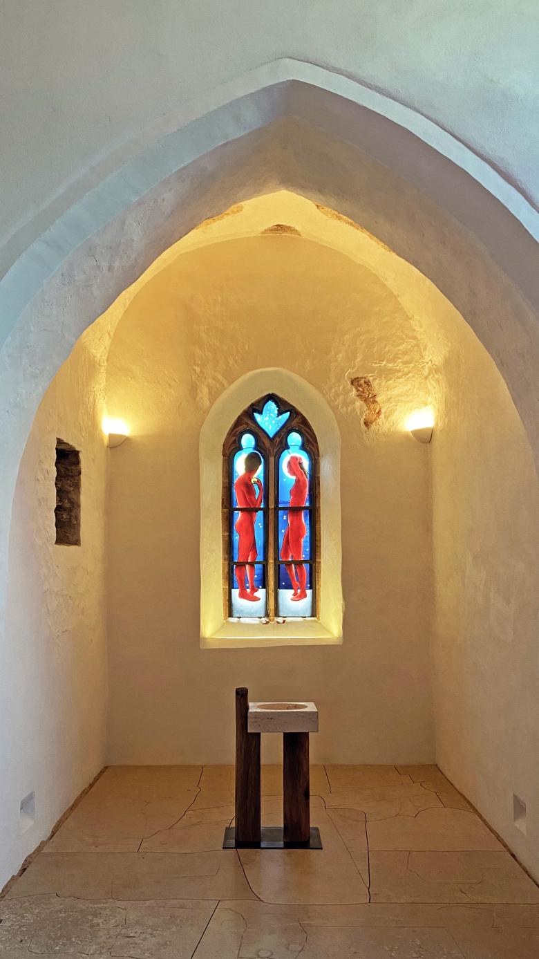 - Taufkapelle = räumlich beschirmend, bergend, behütend, konzentriert, akzentuiert mit einem prägnanten Fenster