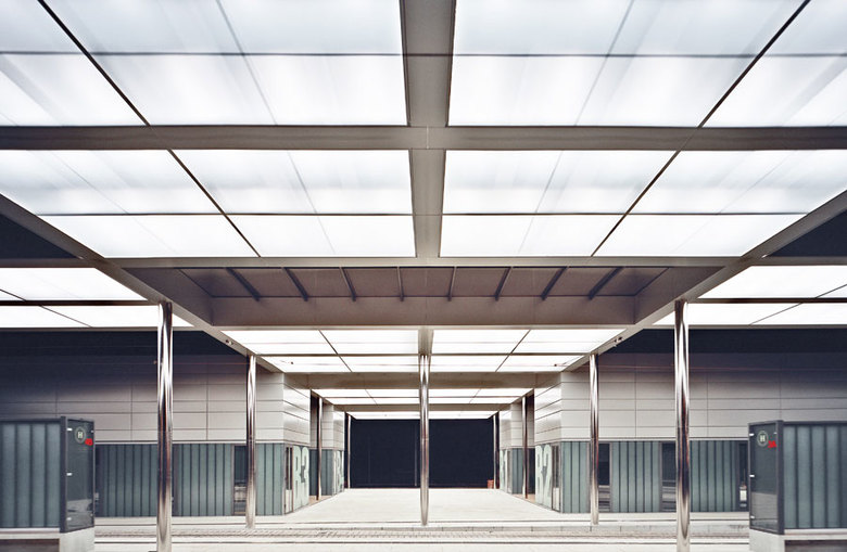 Dem ÖPNV-Terminal kommt, als einzigem hochbaulichen Thema neben der Umgestaltung des Bahnhofsge bäudes, eine zentrale Bedeutung in stadträumlicher, funktionaler und gestalterischer Hinsicht zu, da von diesem Gebäude Impulse für die weitere Entwicklung des Gesamtareals erwartet werden. Das Verkehrskonzept sieht acht überdachte Rendezvouz- Haltestellen vor, als Umsteigebeziehung von Bus auf Straßenbahn und Thüringer Waldbahn, eine ortsüber- greifende Straßenbahn für Nah- und Ferntourismus im Thüringer Wald. Vier Module von 5 x 12 m nehmen unterschiedliche Funktionen und Nutzer auf: Blumenladen, Imbiss, In- formation und Verkauf sowie öffentliche WCęs und sichern über die Haltestellenfunktion einen wirtschaftlichen Betrieb für die Stadt über vermietbare Einheiten. Den fehlenden Raumkanten, der verlorenen Identität und Aufenthaltsqualität des Ortes und dem zu geringen Raumprogramm für ein mögliches Gebäude antworten wir mit einer zusammenhängenden Dachfläche von ca. 50 x 50 m, um zuerst die städtebauliche Dimension zu sichern. Innerhalb der Dachfläche wechseln entsprechend der funktionalen Organisation: Bahnsteig-Fahrbahn, Gebäudemodul-Freifläche, schachbrettartig offene und überdachte Abschnitte, die über einen Fries umrahmt werden. Säulenzierkirschen geben eine vertikale Akzentuierung, die über die offenen Dachsegmente hinaus mit der höheren Nachbarbebauung korrespondieren und als Referenz an den Thüringer Wald stehen. Sämtliche Dächer funktionieren unterseitig als Lichtdecken. Die tagsüber natürlich belichteten offenen Dachfelder wechseln in den Abend- und Nachstunden mit den beleuchteten Deckenfeldern.