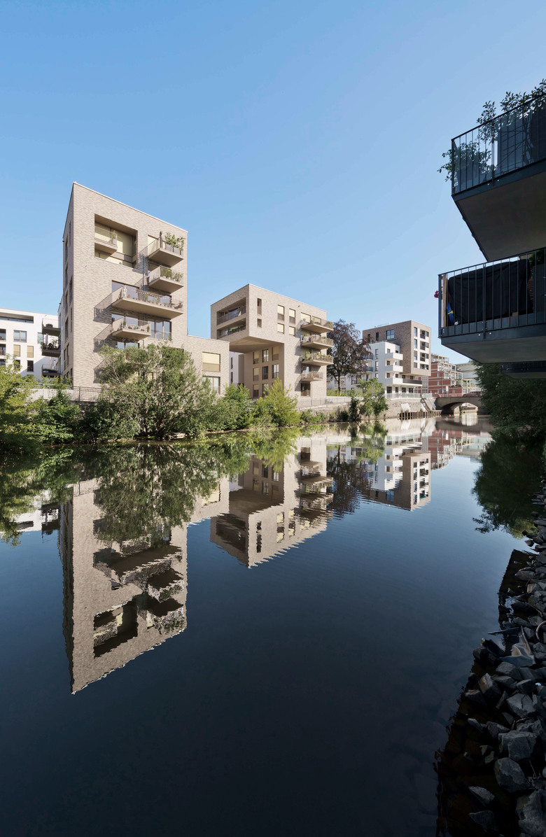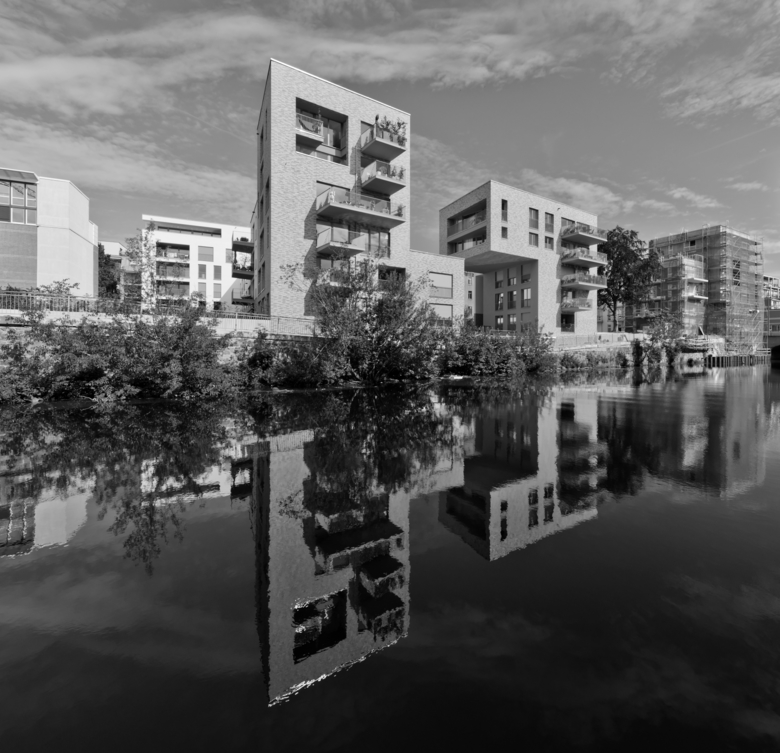 Das Potential eines Wassergrundstückes in der Großstadt wird als Leitmotiv für die neue Bebauung begriffen. In Beachtung der umstehenden zu Wohnzwecken umgenutzten Denkmale in einstiger Industriestruktur sowie neuer Wohngebäude wird eine Wohnbebauung entwickelt, die einen grosszügigen Bezug zur Weißen Elster herstellt. Die Typologie der „Terrassen“ als innerquartierliche Erschließung in Großstädten (z.B. Hamburg-Falkenried) ermöglicht hier eine effektive und konzentrierte Erreichbarkeit der neuen Häuser und mündet gleichermaßen in der direkten Übersetzung als Terrasse mit partieller Absenkung der Kaimauer. Die städtebauliche Mäanderform der Neubebauung wird baulich getrennt, so dass hier sowohl das Tor zur Stadt als auch das Tor zum Wasser mit baulicher Höhe formuliert wird und gleichermaßen eine bauliche Realisierung in Abschnitten gegeben wird. Dabei kann der Bestand an der Nonnenstraße unkompliziert in die neue Gebäudefigur einbezogen werden (selbst eine evtl. Fortführung des nachbarlichen Eckgrundstückes ist denkbar). Die neue Bebauung wird in einer Kombination aus ca. 15 Stadthäusern und 20-25 Eigentumswohnungen gesehen, die in Variationen mit Gartengrundstück, Dachgarten und im Bezug zum Fluss angeboten werden. Die interne Erschließungsstraße bildet hierbei einen halböffentlichen Freiraum für die Anwohner mit Zusatzangeboten zur Parkierung (Stadthäuser mit Garage). Auf diese Weise bleiben die Gartengrundstücke rein privater und geschützter Nutzung vorbehalten, die die unverbaubare Sicht zum Wasser gewährleisten. Häuser und Wohnungen sind mit großzügigen Loggien, Dachgärten und Balkonen über dem Wasser ausgestattet. Die vorgeschlagene überwiegende Verklinkerung der Gebäude schafft ortstypischen Bezug und langfristige Wertigkeit.