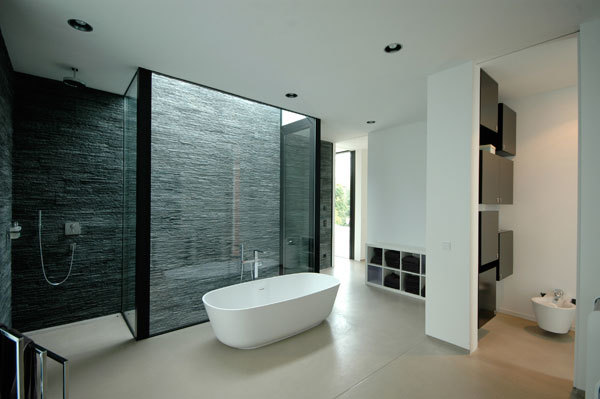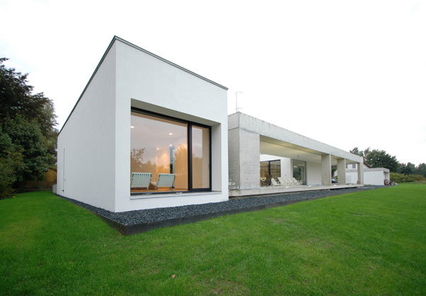Auf diese Weise wird der Wunsch nach einer radikalen Veränderung konsequent verfolgt. Durch die Erweiterung des Grundstücks, das ganz idyllisch und großzügig mit dem anschliessenden Landschaftsraum der Ausläufer des Fichtelgebirges verschmilzt, bietet sich plötzlich die Möglichkeit, Wohnen auf einer Ebene zu organisieren und die Innenräume mit dem Freiraum zu verbinden und in Blickbeziehung zu setzen. Dabei schliesst diese Verbindung auch das bestehende Untergeschoss ein, das mit gläsernen Höfen (Patios) neue Nutzungsqualitäten (Gäste-, Arbeitsbereich,Fitness und Sauna) erfährt. Das Thema der Höfe spielt für die Gliederung der Wohnebene innen und aussen eine entscheidende Rolle, weil dadurch maßgeblich die Gruppierungen von Essen und Wohnen, Kinder- und Elternbereich angelegt werden – sie trennen und verbinden gleichermaßen, scha!en einen spannungsvollen Wechsel zwischen Innen und Außen. Die Ausrichtung der Wohnbereiche erfolgt im Großen und Ganzen nach Süden und Westen, wobei die großen Dachüberstände das passive, energetische Konzept des Hauses unterstützen. Sollarkollektoren auf dem Flachdach sorgen für Wärme im Haus. Der freizügige Umgang mit Fläche soll jedoch nicht als verschwenderischer Umgang mit Naturressourcen verstanden werden; einfache, natürliche, nachwachsende oder recyclefähige Rohsto!e kommen zum Einsatz , die Ausstattung des Hauses ist reduziert – im Sinne von Konzentration auf Wesentliches, gezielte Materialien und Wirtschaftlichkeit. Mit der Fertigstellung des Umbaus ist eine massgeschneiderte Hülle für die sich wandelnden Bedürfnisse der Bewohner entstanden – ein neuer Rahmen für das Alte, ein verbindliches Zusammenwachsen und schöne Aussichten.