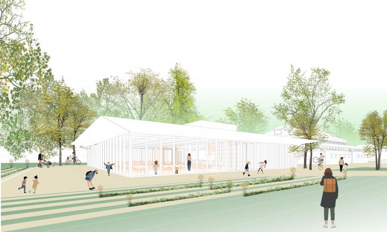 Auszug Jurybeurteilung: „Die Verfasser*innen schlagen einen kompakten Baukörper mit zwei Ein- gängen in Nord-Süd-Richtung vor.