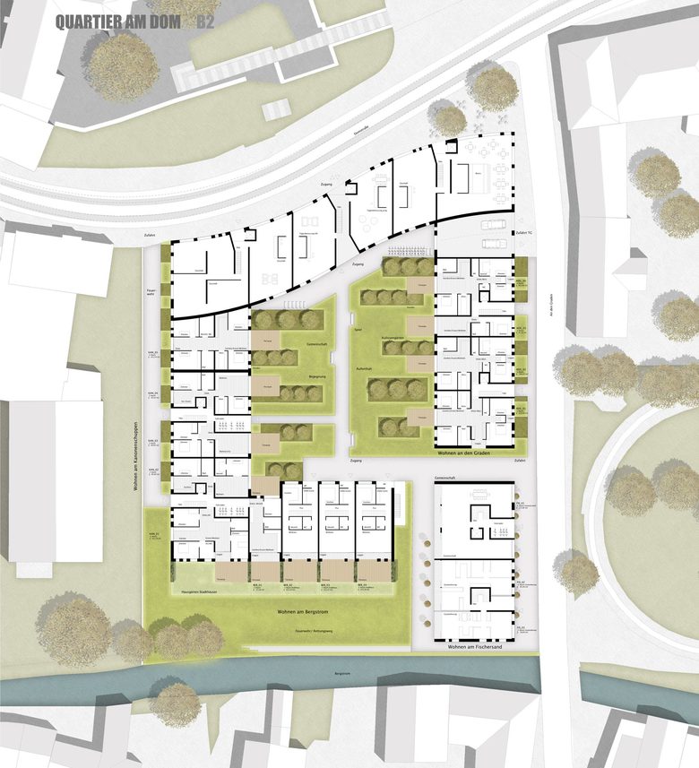 Durch einen halböffentlichen Zugang in der Mitte des Flügels am Domplatz kann der Innenhof betreten werden. Eine Mittelerschließung wird flankiert von Kulissengärten (Staudenbeete mit linear gepflanzten, dekorativen Ziersträuchern), die die privaten Loggien und Terrassen der Erdgeschosswohnungen in lockerer, rhythmischer Abfolge von der halböffentlichen Hofmitte abschirmen. Der offene Hofmittelpunkt dient als Tre punkt der Anwohner und halbö entliche Erschließung der südlichen Gebäudeflügel zugleich.