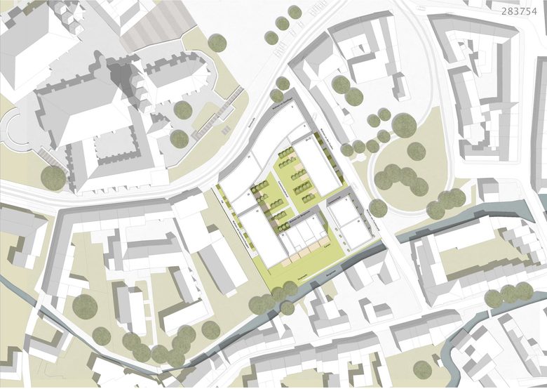 Der unaufgeregte Ansatz, die neue Bebauung quasi entlang der Grundstücksgrenzen anzulegen, eröffnet mit der Verschränkung des Südflügels und dem Lösen des sogenannten “Annexhauses“ zunächst eine grüne, luftige Mitte und zudem den erforderlichen wie bereichernden Freiraum zum Bergstrom - vor allem aber wird mit dieser klassischen Quartiersform eine erste und grundsätzliche Gliederung für Wohntypologien angelegt: die Basis für ein differenziertes Angebot zum Einquartieren.