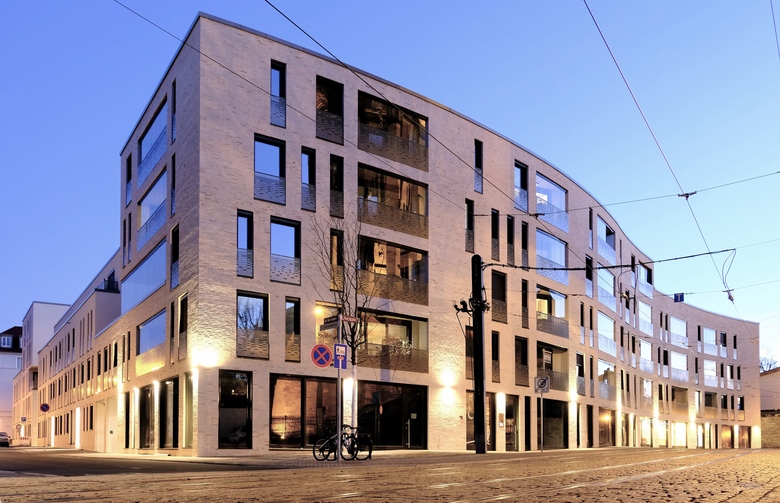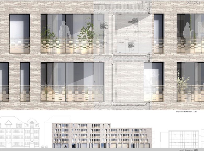 Langlebige, widerstandsfähige Materialien mit optischer und haptischer Ästhetik, wie z.B. Klinkersteine und mineralischer Kratzputz, sollen im Verhältnis der Live-Cycle-Cost-Betrachtung die Beständigkeit der neuen Bebauung langfristig unterstützen und in unmittelbarer Nähe zum mächtigen Dom das neue Quartier auch selbstbewusst und vereinend behaupten. Das Wechselspiel mit filigranen Verglasungen und subtil verlaufenden Materialperforierungen sollen die Übergänge vom urbanen Umfeld zu „weichen“ privaten Bereichen mit Raum für viel Individualität unterstützen.