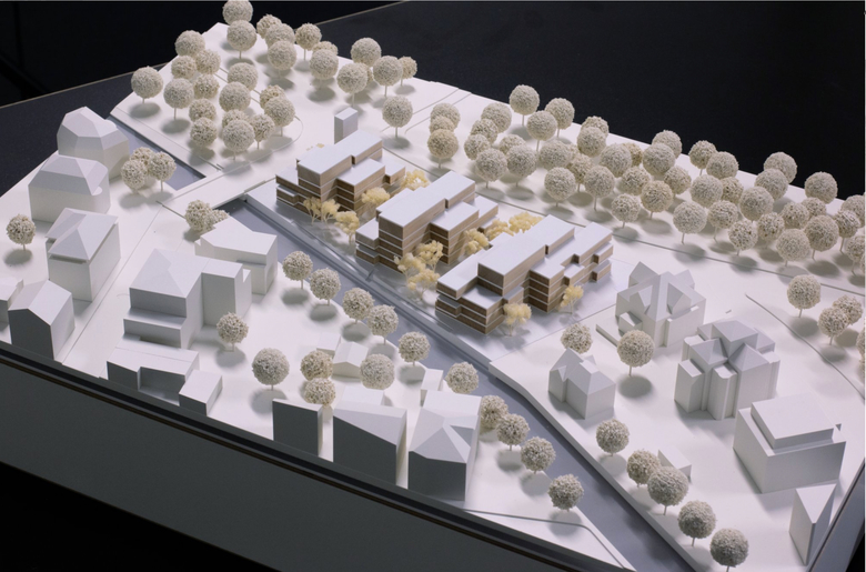Das Verschmelzen der Häuser erö net ein Durchfließen des Grünraumes vom nördlichen Park bis zum südlichen Flusslauf. Freiraum wird zwischen den Häusern gewonnen. Gleichzeitig werden die Gebäude hauptsächlich ost-west-orientiert, so dass die laute Nordseite vorrangig der Haupterschließung und der schönen Aussicht vorbehalten bleibt. Die Fügung zu drei Versatzhäusern wird außerdem zur inneren Erschließung genutzt: zwei dezentrale Treppenhäuser und ein großzügiger zentraler Aufzug gewährleisten die vertikale Verbindung in den Häusern. Auf diese Weise wird auch der zweite Rettungsweg baulich angeboten. Somit beziehen sich die Aufstellflächen für Feuerwehr und Rettungsfahrzeuge auf den unmittelbaren Straßenraum, so dass der Freiraum zwischen den Häusern einer unbefestigten ungestörten Gestaltungs- und Nutzungsvielfalt o en steht.