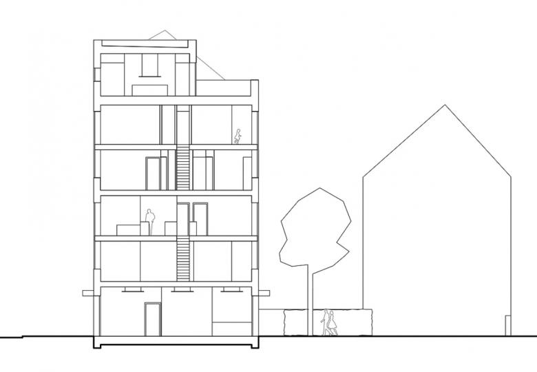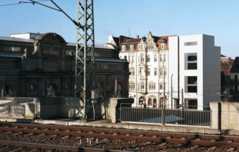 Der unmittelbar am Bahnhof-Mitte gelegene Baukörper, bildet einen kontrastreichen Baustein in der noch zum Teil lückenhaften, historischen Blockrandbebauung an der Weißeritzstraße. Zahlreiche Straßenbahnlinien kreuzen den Bahndamm und verteilen sich von hier aus in fast alle Richtungen der Stadt. Wir suchten für unsere Vorstellung vom Leben und Arbeiten in der Stadt ein Grundstück, dessen Umfeld eher dynamisch ist und Entwicklungschancen hat und auf keinen Fall die Langeweile eines normalen Neubaugebietes besitzt. Dies alles bietet der Standort. Das Konzept des Hauses baut gewissermaßen zwei jeweils 3-geschossige Einfamilienhäuser übereinander und gliedert sich in zwei – auch äußerlich sichtbar – unterschiedlich große Teile. Im größeren Teil befinden sich die Lebensräume, die in diesem Teil frei organisiert, jeweils den individuellen Bedürfnissen angepasst und auch wieder veränderbar sind, da es keine tragenden Konstruktionen darin gibt. Im kleineren Teil befindet sich das allgemeine Treppenhaus mit Fahrstuhl, der Durchgang zum Garten und zu den Parkplätzen sowie alle Nebenräume wie Technik, Bäder, Hauswirtschaftsräume. Diese Gliederung des Hauses ist zugleich ein gestalterisches Element, das im Zusammenspiel mit dem gründerzeitlichen Nachbarhaus dessen vertikale Gliederung fortsetzt. Insgesamt stellt es sich als zeitgenössisches Bauwerk dar, dass mit ganz wenigen Gestaltungsmitteln auskommt. Bündig in der Fassade liegende große Fenster, die dem Haus ein unverwechselbares Gesicht geben, das eher an ein Atelierhaus als an ein Wohnhaus denken lässt. Es soll zeigen, dass die Bewohner diesen Ort trotz der Schwierigkeiten des Standortes wie Lärmbelästigung, Sonneneinstrahlung, Hochwasserrisiko ganz bewusst gewählt haben. Diese wurden durch modernste Technik und geeigneten Lärm- und Sonnenschutz weitestgehend minimiert. Es war uns wichtig, das Haus offen und großzügig zu gestalten. Es fordert sowohl die Bewohner als auch die Betrachter. Dies hat sich gelohnt, da die Ausblicke in die lebendige Stadt grandios sind. Bewusst wurde auf Balkone an der Fassade verzichtet. Zur Gartenseite hin sind im Erdgeschoss und in der 6. Etage Freiräume angeordnet. Der Freiraum im Erdgeschoss gliedert sich durch Hainbuchenhecken in zwei Bereiche. Im Garten ist eine 3-stämmige Kieferngruppe neu gepflanzt. Der gesamte Freiraum hat eine wasserdurchlässige unterschiedlich grobe Oberfläche aus schieferähnlichem Gestein. Die Dachterrasse im 5. Obergeschoss bietet für die die junge Familie ein zusätzliches Freizimmer mit großartigen Ausblicken.