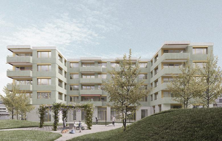 Die städtebauliche Setzung der beiden neuen Wohnbauten der Siedlung 17 mit 45 Wohnungen und einem Kolonielokal spannt einen Innenhof als Aufenthalts- und Begegnungsraum auf, der zur Aneignung durch die zukünftigen Bewohner und zur Identität der Siedlung beitragen soll. Die Hueb- und die Zürcherstrasse sind durch den Hof miteinander verbunden, die Mitte dieser Verbindung weitet sich platzartig auf und lädt mit einer von Glyzinien berankten Pergola, sowie einem Brunnen zum Bespielen ein. An der seitlich angrenzenden Böschung bietet ein Spielplatz Spielmöglichkeiten für die Kleinen, sodass für alle Altersgruppen etwas vorhanden ist. Die Grünflächen der Siedlung werden als bunt blühende Wiesenflächen angelegt und mit heimischen Ahorne, Linden und Kirschen überstellt.
