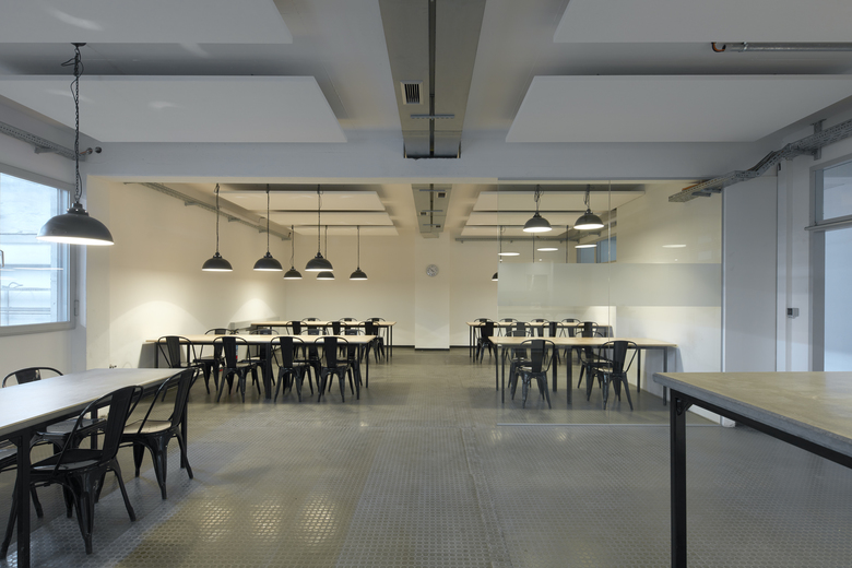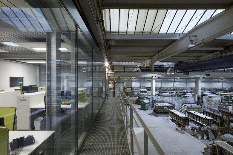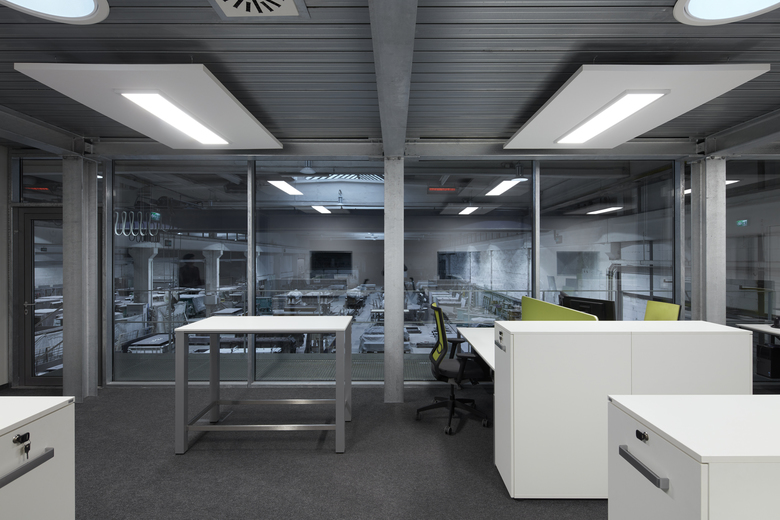 Bei laufendem Betrieb ein komplettes Planungsbüro einbauen? Das muss schnell gehen und soll möglichst nicht stören/ darf nicht stören. Die Konstruktionsteile werden weitgehend vorgefertigt: verzinkte Stahlskelettkonstruktion mit Blechpaneelen und Pfosten-Riegelfassade. Den authentischen Industrielook verstärken Noppenboden, Gitteroste, weiße Wände und Akustiksegel. Die komplette Glasfassade zur Werkstatt verschafft Ein- und Ausblicke. Heliostaten lenken und verstärken das Tageslicht. Wärmerückgewinnung realisiert die kontrollierte Lüftung, dazu eine Fußbodenheizung für behaglichen Komfort.