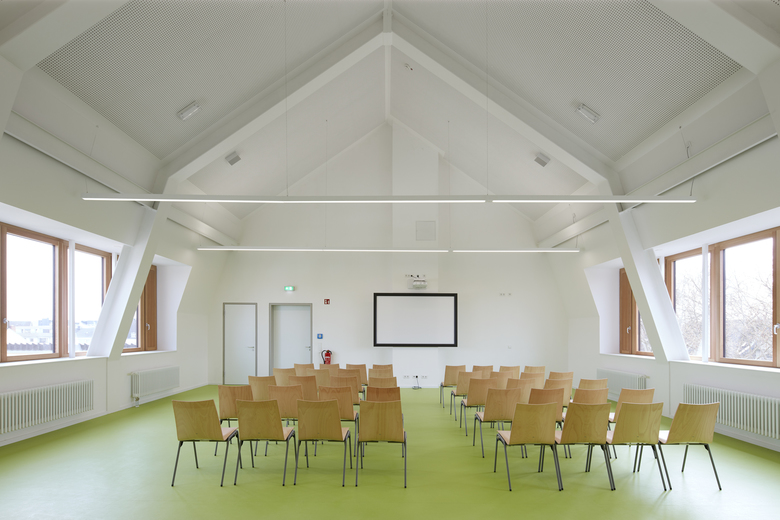 Das Schulgebäude von 1909 wird von zwei- auf dreizügig erweitert. pier7 architekten bauen das Dachgeschoss im laufenden Betrieb aufwendig aus: Altes Dach runter, neue Stahlrahmenkonstruktion rein. Auf dem Bestandsgebäude entstehen huckepack lichte Räume mit Rundumblick. Dazu zeltartige Decken mit bis zu 7 Metern Höhe und raumhohe Holz-Alu-Fenster mit Nachtlüftungselementen. Die Stahlrahmenkonstruktion ist sichtbar, Decken und Wände erstrahlen weiß, Fußböden hellgrün und Türen setzen gelbe Akzente. Eine Raumakustik ist integriert, die Dachflächen energetisch optimiert.