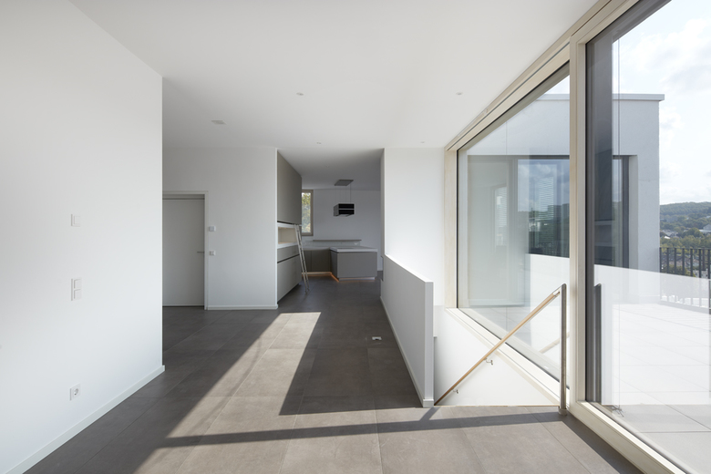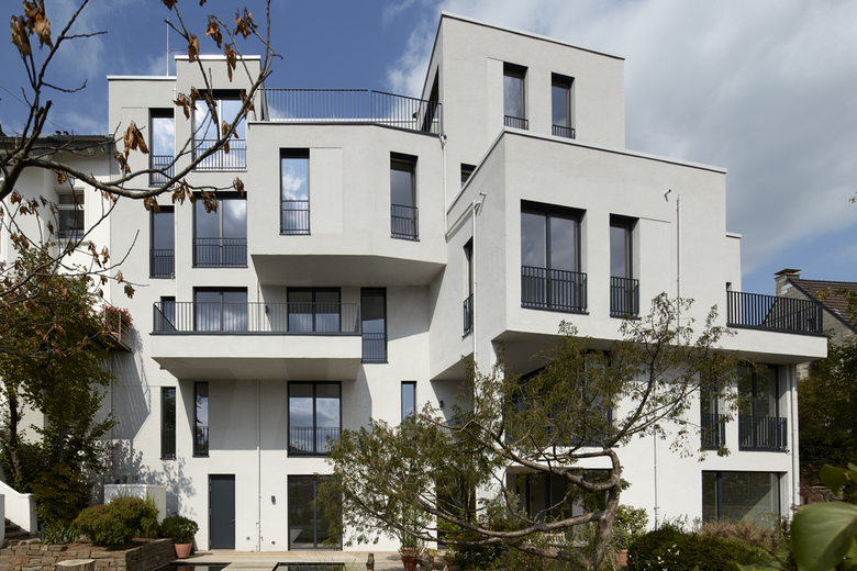 Das expressive Stadthaus an der Hangkante kontert das benachbarte Gründerzeithaus. Durch Fassaden- und Raumversprünge entsteht eine spannende Dynamik. Das 5-geschossige Gebäude bietet drei außergewöhnliche Mietwohnungen und eine Maisonette für die Bauherren. Feinsinnige Sichtachsen und maximale Bewegungsfreiheit prägen den individuellen Lebensraum. Glatte weiße Wände, geschosshohe Holztüren, großformatige Fliesen, Kamine, Aufzug, dazu der unverbaubare Panoramablick ins Tal. Gleichzeitig realisieren Fußbodenheizung, kontrollierte Raumlüftung sowie Fotovoltaik ein Niedrigenergiehaus. In jeder Ebene Balkone, die nicht einsehbar sind, ganz oben eine üppige, geschützte Außenterrasse für die Bauherren, draußen am Terrassengarten die Orangerie.