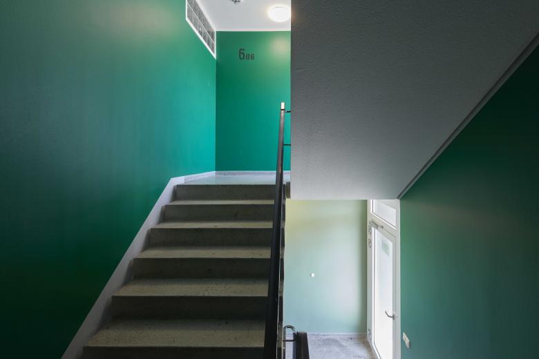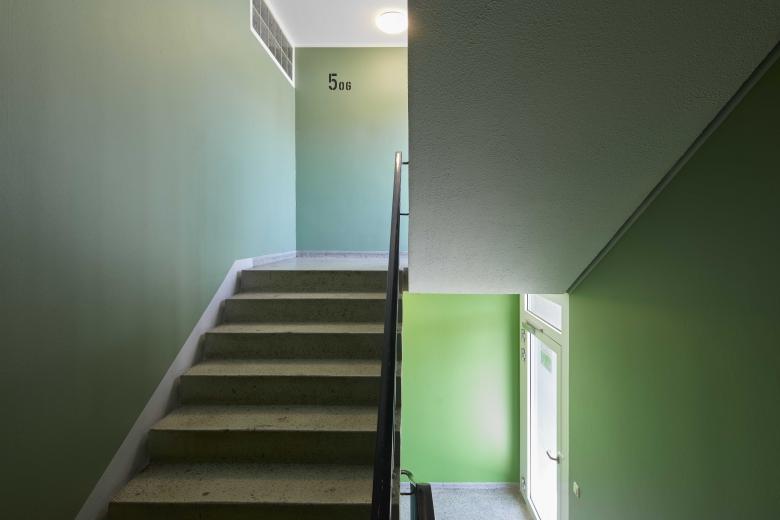 Die einzelnen Etagen werden mit 3 abwechselnden Grüntönen auffindbar; jede Wohnungstür reagiert auf die jeweilige Etagenfarbe.