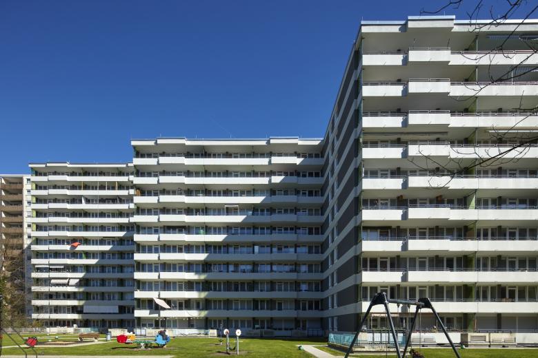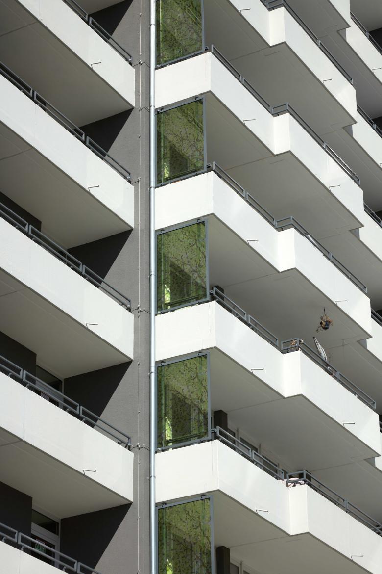 Die Putzstruktur der Balkone wechselt glatt mit strukturiert, jede einzelne Wohnung wird auf der Fassade sichtbar. Grün gepixelte Sichtelemente frischen die Häuser auf.