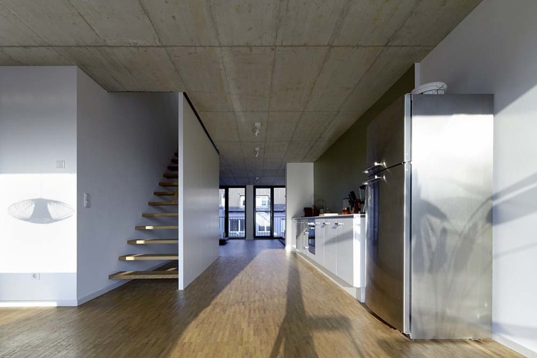 Nachverdichtung – Auf das bestehende 3-geschossige Gebäude werden 3 weitere Geschosse gebaut. Großzügige Öffnungen und die freien Grundrisse ermöglichen ein Durchwohnen zwischen Straße und Innenhof. Glatte, weiße Wände, sichtbare Betondecken, Estrich- und Holzfußböden und ein optimierter Energiestandard sorgen für eine behagliche und effiziente Wohnsituation.