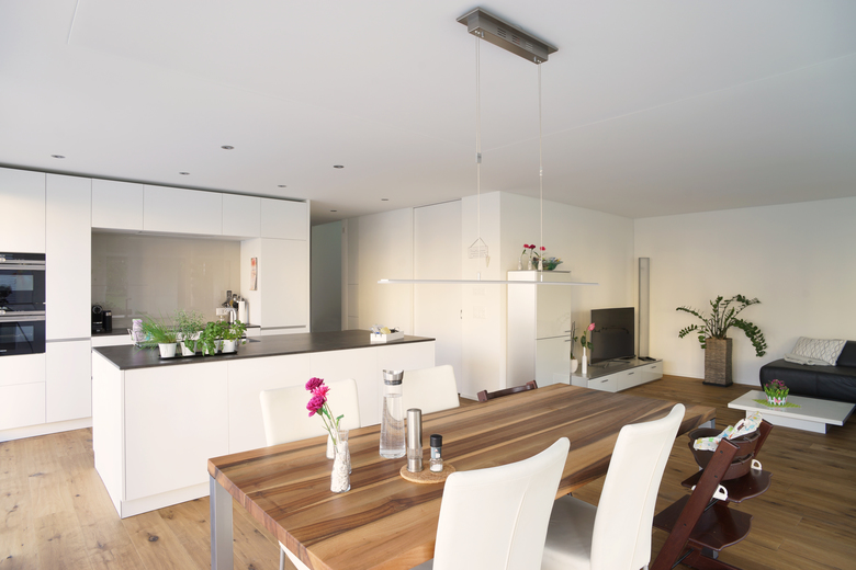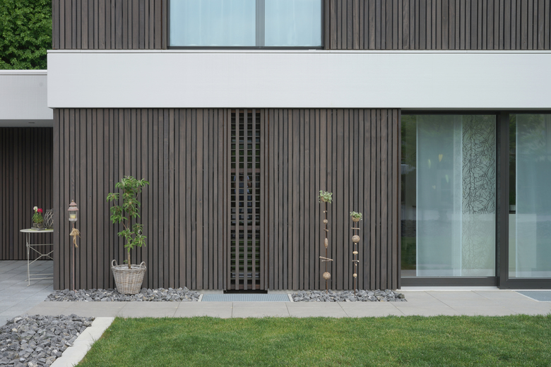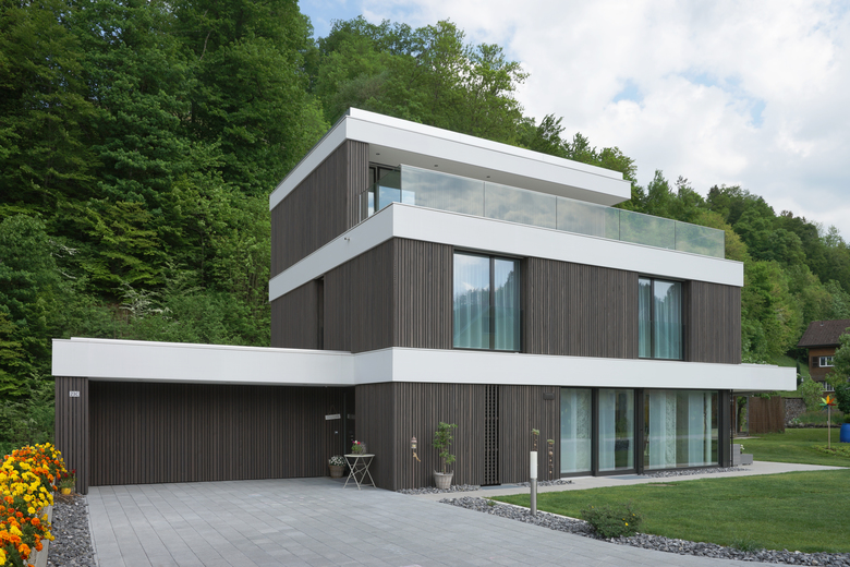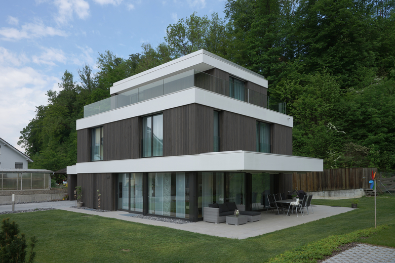 Eine klare Formensprache im Zusammenspiel mit der feingliderigen, druckimprägnierten Holzfassade verleihen dem Gebäude einen eigenständigen, ausdrucksstarken Charakter mit viel Wohnlichkeit. Die innere Organisation wurde für die junge Familie zugeschnitten und bietet Raum für unterschiedliche Bedürfnisse. Die grosszügige, optimal besonnte Dachterrasse ermöglicht eine überraschende Fernsicht über die Dächer der Nachbarbauten und wird so zu einem wertvollen Aussenraum.