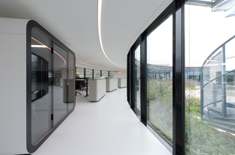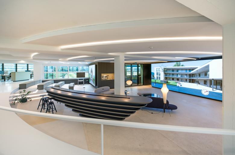 Der «Loop» ist in zwei Bereiche aufgeteilt: Im äusseren, leicht erhöhten Ringbereich sind zwanzig Doppel-Arbeitsplätze mit jeweils einem Sideboard und sechs schallgedämmte Besprechungsboxen angeordnet. Der Kern des Rings ist als «Wohnraum» konzipiert. Hier sind der Empfangsbereich, die «Arena» (mit grossem LED-Screen für Präsentationen und Schulungen), zwei Besprechungsräume, eine Café-Bar und ein begrünter, offener Innenhof angelegt.