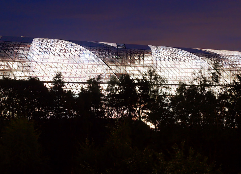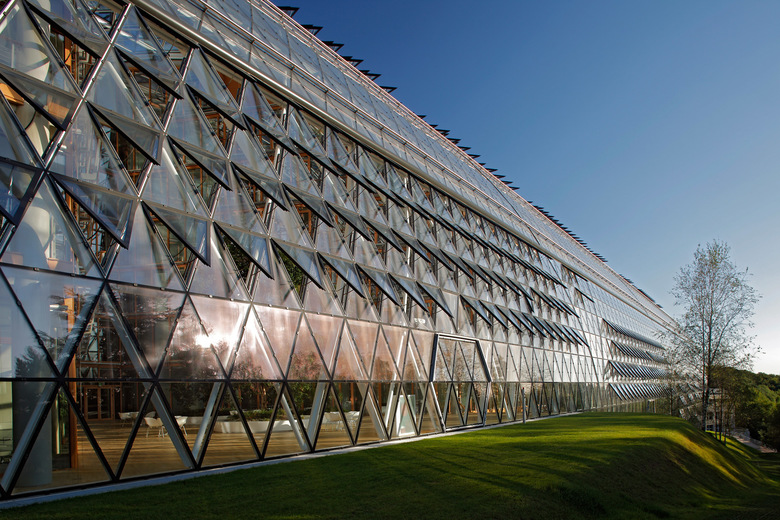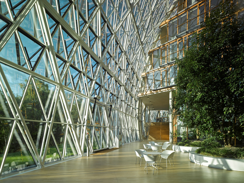 Eine leichte Glashülle überspannt die V-förmigen Bürotrakte, die durch Atrien und Wintergärten miteinander verbunden sind. Der Entwurf nimmt allseitig die vorhandenen Geländehöhen auf und fügt sich so in die Landschaft ein. Der Geländeverlauf wird im Inneren des Hauses fortgeführt, indem sowohl die Hallen als auch die Restaurants, Konferenzräume und öffentliche Nutzungen terrassiert sind.