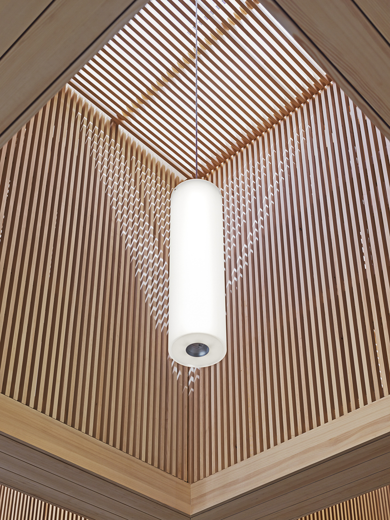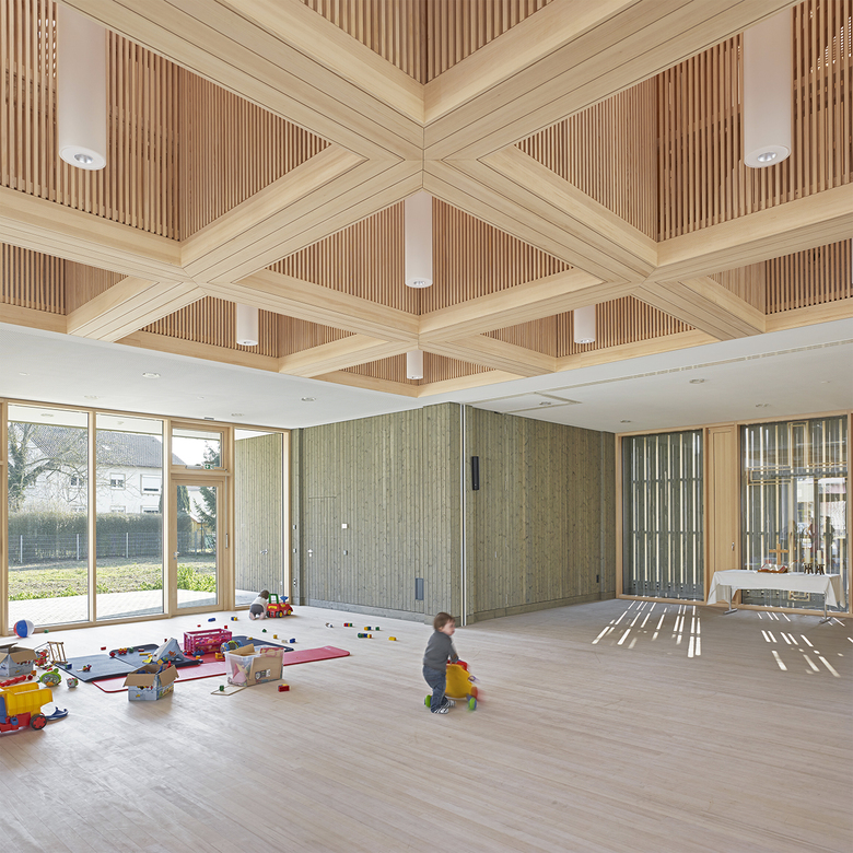 Die Anmut des feierlichen Raumes kann dadurch im Großen wie im Kleinen stets erhalten bleiben. Die Geborgenheit des gemeinsamen Daches wird im Innenraum durch die Vierung der Firstbinder mit neun Lichtfeldern überhöht. Das Himmelslicht wird von einem Filterwerk aus filigranen Holzleisten in heimischer Weißtanne gerahmt. Das helle Holz steht im Kontrast zur grauen Holzschalung und verleiht dem Gemeindezentrum in der Reflexion des einfallenden Lichts eine warme und feierliche Atmosphäre.