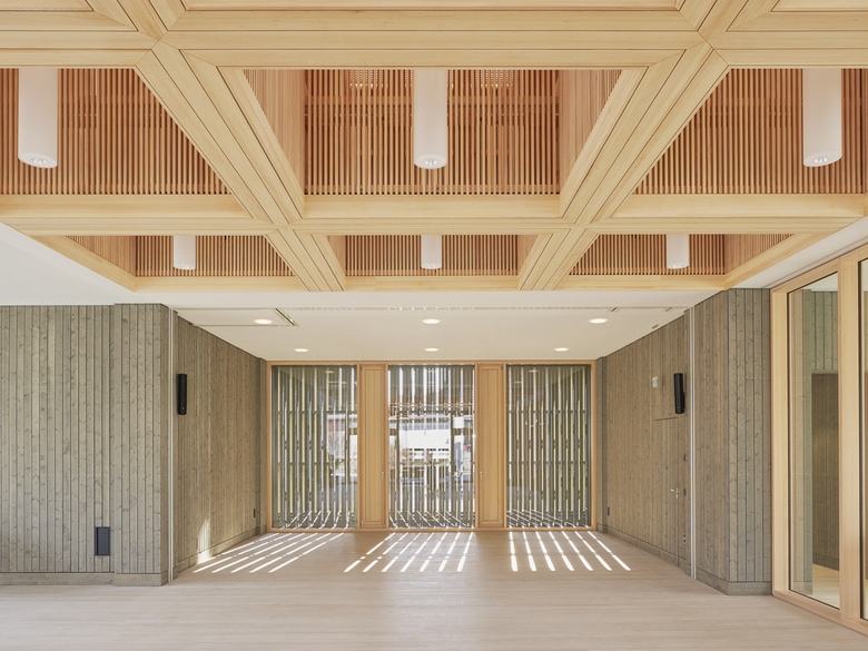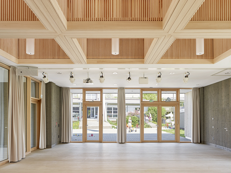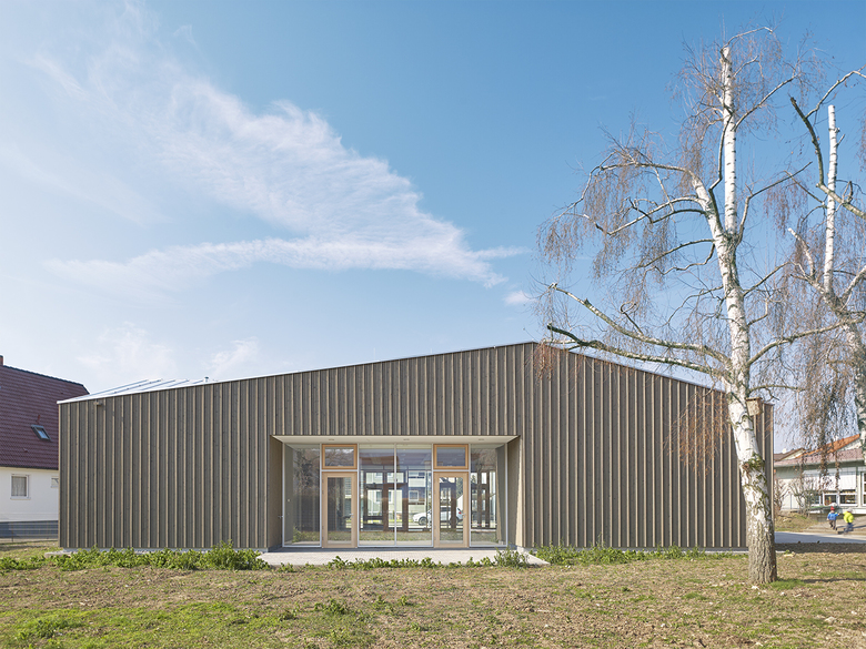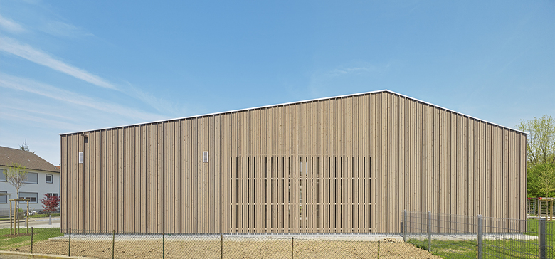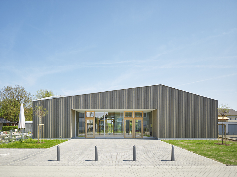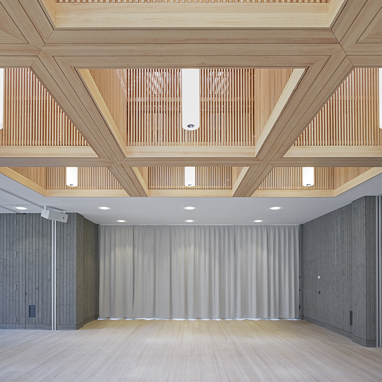 Als Ganzes gewährt der Saal vielfältige Nutzungsmöglichkeiten mit allseitig natürlicher Belichtung und Belüftung. Das markant gefaltete metallische Dach wird von den vier Eckkörpern getragen, die mit einer grauen Holzschalung verkleidet sind. Metallverblendete Holzprofile rahmen die großen Fensteröffnungen. In Saal und Foyer liegt ein warmer Holzdielenboden aus Weißtanne.