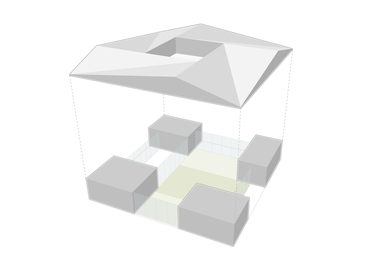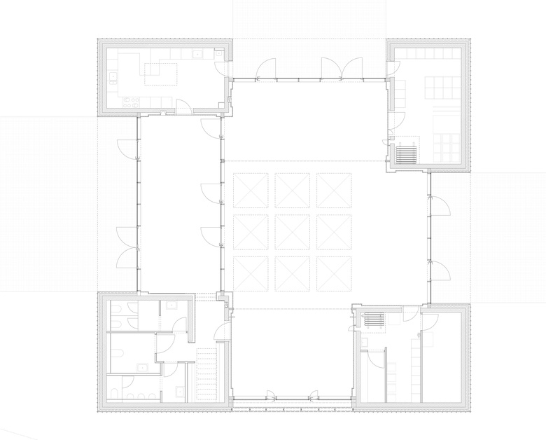 Die Saalfläche wird nur an den Ecken durch vier geschlossene Baukörper begrenzt, die alle untergeordneten Funktionen aufnehmen. Es entsteht ein zentraler von oben belichteter Raum, der durch vier nach außen orientierte Flügel behutsam gegliedert wird. Die geteilten Säle sind jeweils einem Flügel zugeordnet. Das Foyer besetzt den westlichen Flügel zur Hansjakobstraße und kann wie ein vierter Saal genutzt werden. Der kleinste südliche Flügel beherbergt den Sakralraum, der auch direkt vom Foyer zugänglich ist und im geöffneten Zustand ähnlich einer Seitenkapelle ablesbar bleibt.