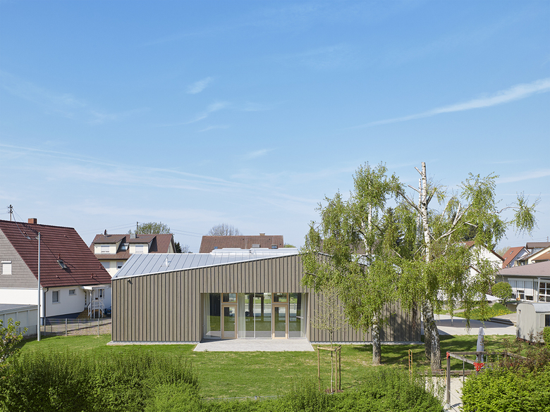 Das neue Gemeindehaus steht zentral und offen nach allen Seiten im Gemeindegarten. Das Zentrum des Hauses ist der Gemeindesaal, der in alle Himmelsrichtungen eine direkte Beziehung mit dem großzügigen Außenraum eingeht. Überdachte Vorbereiche bilden jeweils den Übergang von Innen nach Außen. Zur Hansjakobstraße wird der Eingang mit einem großen Vorplatz markiert und nach Osten erhält der große Saal eine Loggia in den rückwärtigen Garten. Dem Kinderhaus gegenüber entsteht ein geschützter Freibereich, der auch mit dem kleineren Saal zusammen bespielt werden kann.