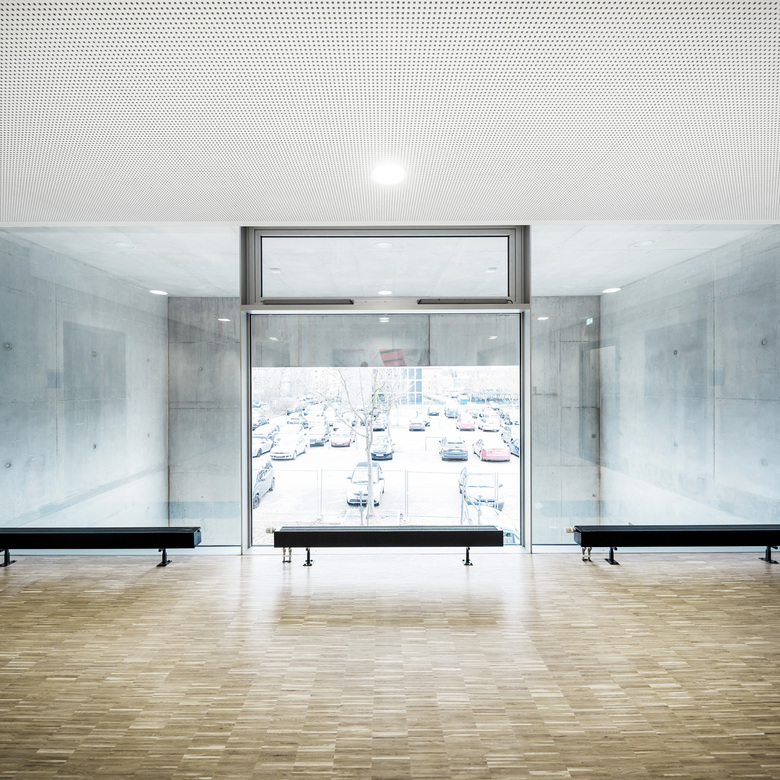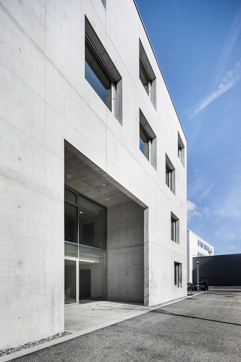Die kräftige Fassade aus sichtbarem Beton mit einem einheitlichen Fensterformat wirkt zugleich streng und verspielt. Aus der Ferne gleicht sie einem Würfel mit unregelmäßigen Augen. Kommt man näher, zeichnen sich die Betonierfugen und die Abdrücke der Schalungsstöße auf den glatten Betonwänden ab. Die Flächen des Kubus werden durch die Fensterlöcher unregelmäßig perforiert.