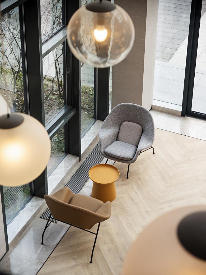 Due to the hotel's moderate scale and highly flexible and multifunction spaces, the design is coherent throughout yet giving focus to various spaces. Light wood, as a natural material to integrate the hotel's tone, giving a warm and welcoming feeling, well placed as a legacy of the International Horticultural Exhibition. The natural texture of the flooring harmonizes with the pale green graphics application to the walls to create a casual, family friendly atmosphere.