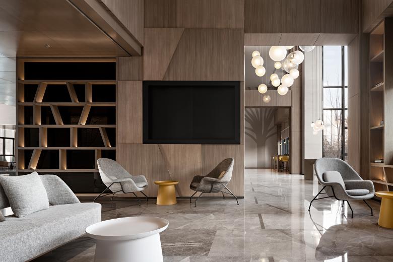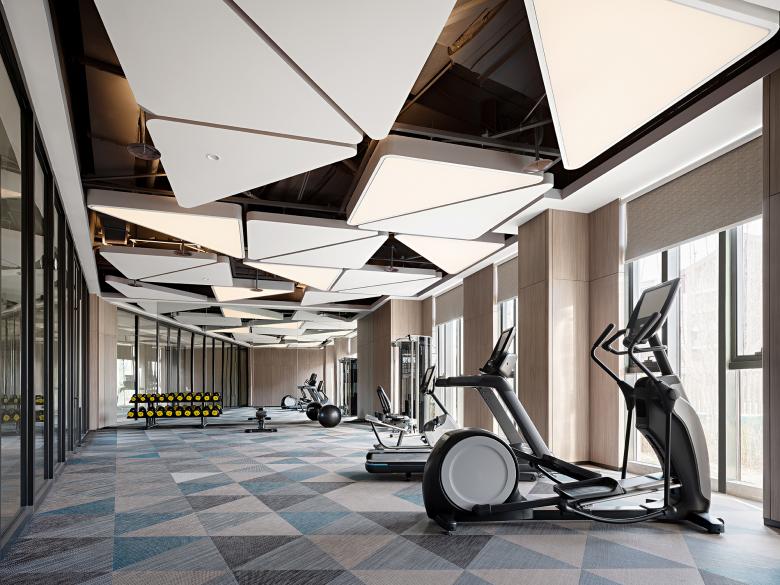 On the other side of the restaurant are the meeting room and fitness area. Large, medium and small spaces can be flexibly arranged in the meeting room. Warm wood color is the basic tone, and the floor adopts woven rubber floor with geometric pattern, creating a light and modern, relaxed but solemn feeling. The ceiling and floor of the gym continue the geometry element of the meeting room, with bright and light colors. Through floor-to-ceiling glass, it is visually connected with the public corridor, and an energetic atmosphere is achieved.