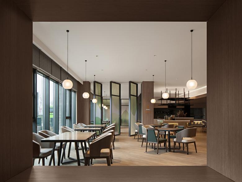The all day cafe provides a casual ambiance with choice of seating clusters and private rooms, all centered around a buffet area. By utilizing full height pivot screens, the ADD can be combined with the reception and lobby bar or be completely separated for certain events. These movable screens are laminated with green patterns, bring in a sense of nature. Adjoining is a glazed in toddler play area with vibrant color.