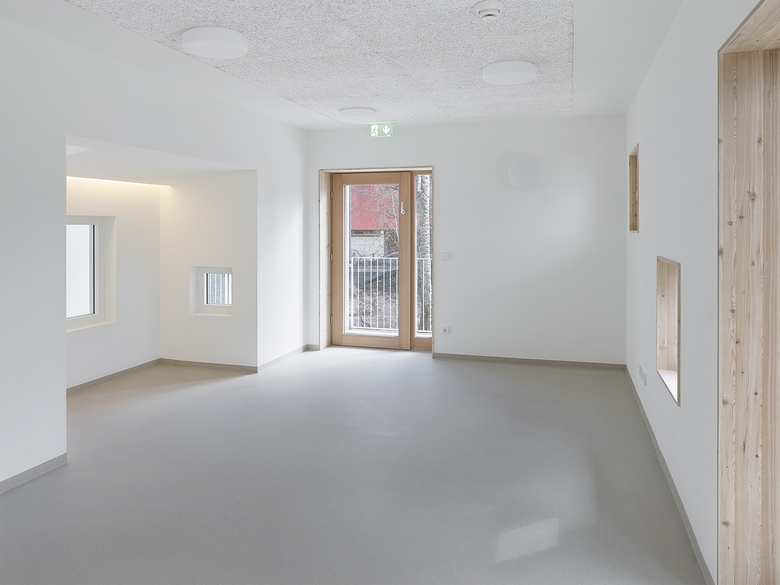 Der extrem kleine Bauplatz in Hanglage führt unter der Prämisse, dass dem Aufenthalt im Freien mindestens der gleiche Raum beizumessen ist wie dem Geschützten und Geborgenen im Inneren, zu dem komprimierten dreigeschossigen Baukörper. Der flächeneffiziente Grundriss vermeidet unbrauchbare Verkehrsflächen. Haupteingang und Hauptgruppenräume liegen zentral auf der mittleren Ebene, die Kleinsten spielen ganz oben, im unteren Gartengeschoss finden sich die gemeinsam genutzten Räume für alle.