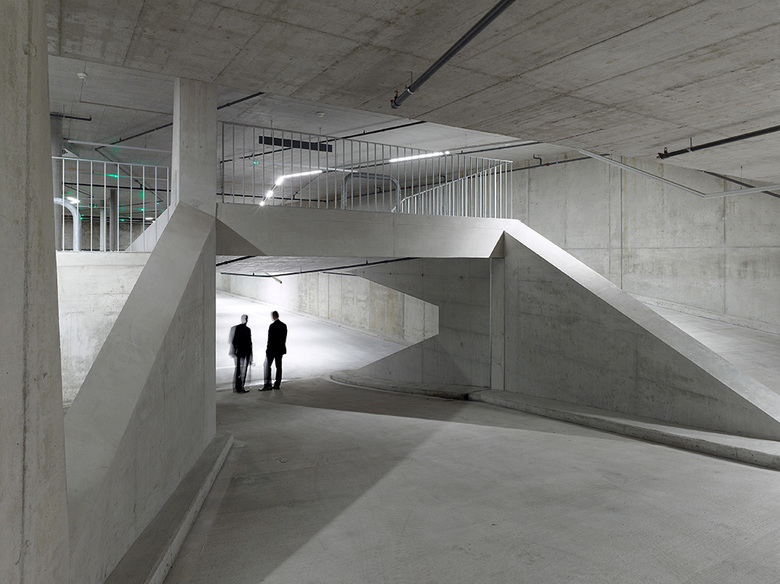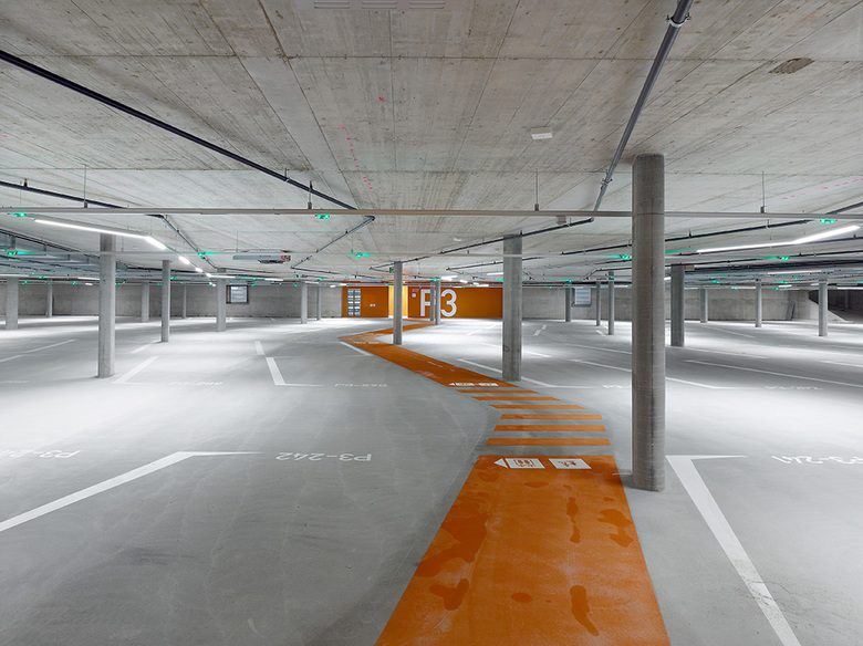 Das Parking umfasst auf einer Gesamtfläche von 14'800 m2 rund 500 Abstellplätze verteilt auf 2 Untergeschosse. Die Zufahrt erfolgt direkt ab Kreisel Silbergasse. Die interne Erschliessung wird über seitliche Rampen und 2 Splitlevel sichergestellt. Das Verkehrsregim ist zwecks besserer Orientierung und Manöverierbarkeit auf eine vollständige Schrägparkierung ausgelegt. Ein Signalethikkonzept soll dem Besucher die Orientierung erleichtern.