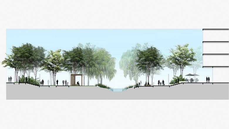 The master plan creates a series of interweaving greenways, parklands, and linear parks to form an interconnected network of urban spaces. Existing rivers and creeks have been preserved, reimagined and integrated, creating recreational opportunities, such as water-touching experiences and riverside promenades for jogging and cycling, all seamlessly connected to the wider Bintaro cycling loop.