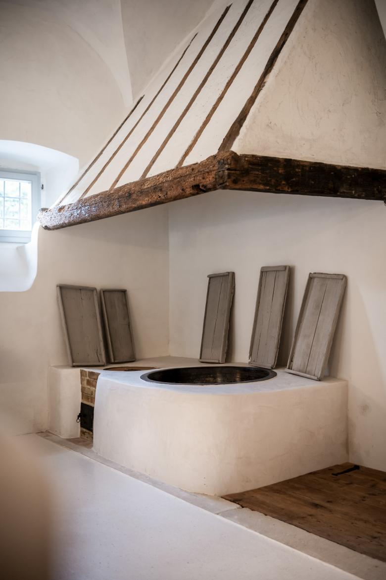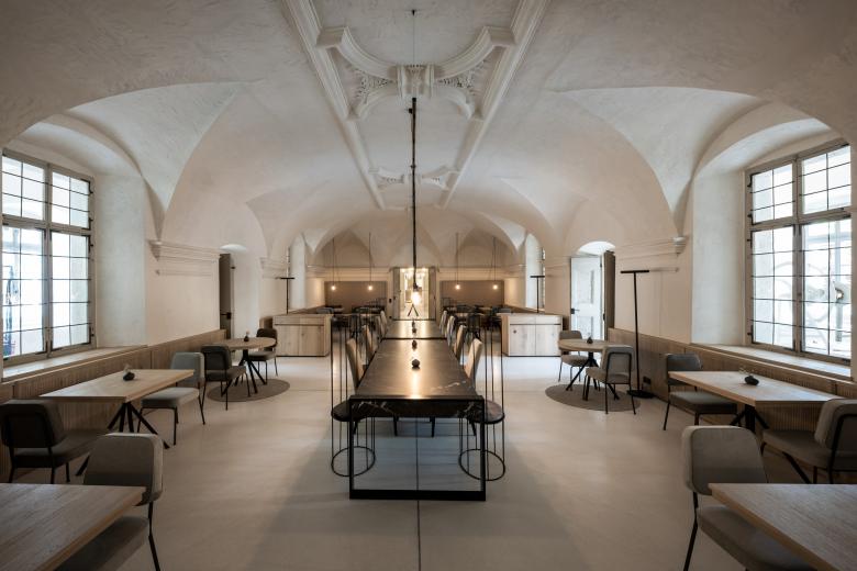 The original ceilings and decorations in the common spaces on the ground floor were conserved and restored. The dominant shades are white, grey and black, the historic colours of the monastery.