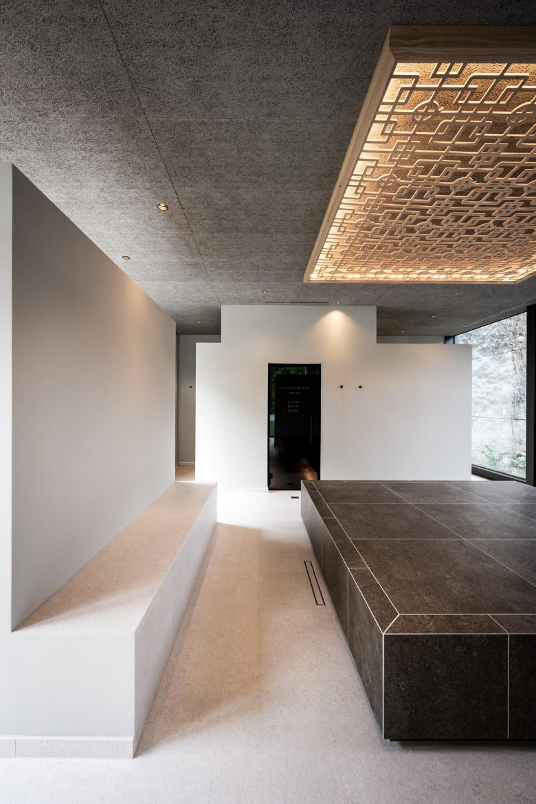 The wellness area includes a first relaxation area with loungers, a treatment area and a second relaxation area facing the ‘biolake’, a pool of natural water with dark blue tints. Next is a third relaxation area in an open gallery in the green courtyards, then the saunas (a bio sauna and a Finnish sauna) and a particular type of hammam or wellness course that revolves around a large heated dark stone.