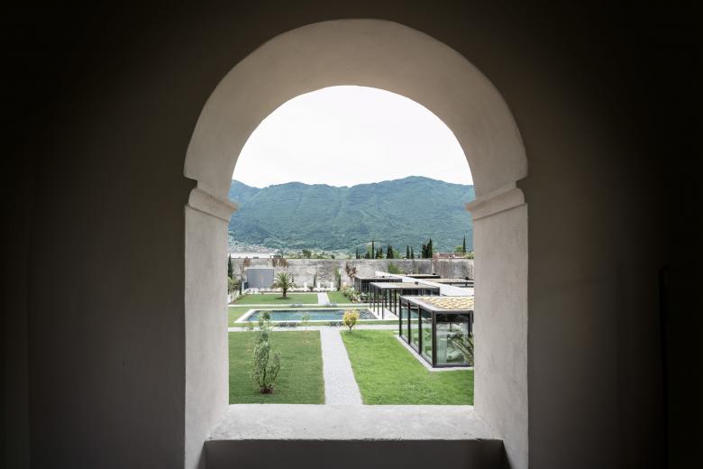 To restore the majestic power and spiritual dimension of an old monastic centre and make its most distinctive elements the main features of a unique and charming hotel, was the mission pursued by noa* in the project to renovate the Monastery Serve di Maria Addolorata in the centre of Arco, situated at the northern tip of Lake Garda. This noble complex with its’ extensive garden, is encompassed by a high surrounding wall and dates all the way back to the second half of the 17th century. Half of the Monastery building, which also hosts a church and cloister, where nuns continue to live, has been left untouched and in 2020 work on the hotel project began in close collaboration with the Trento Office of Cultural Heritage.