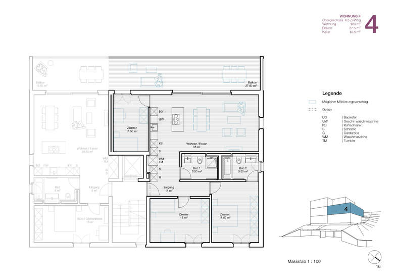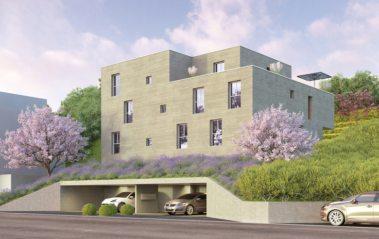 Wohnen im Grünen, stellt den Grundgedanken des architektonischen Konzeptes des Mehrfamilienhauses dar. Volumetrisch wird die Liegenschaft als eine Einheit gelesen. Dank der Hanglage bieten sich die Technikräume und Parkplätze im Sockelgeschoss an. Die fünf Wohnungen werden durch ein zentrales Treppenhaus mit Lift erschlossen. Jedes Geschoss weist seine eigenen Aussenraumqualitäten auf. Die Wohnungen im Erdgeschoss verfügen über einen grosszügigen, geschützten Garten mit einer intimen Atmosphäre. Die Wohnungen im Obergeschoss profitieren von grossen Balkonen. Die Attikawohnung, bietet einen wunderschönen Ausblick von der grosszügigen Terrasse und wird direkt durch den Aufzug erschlossen.