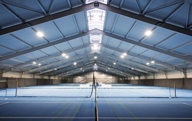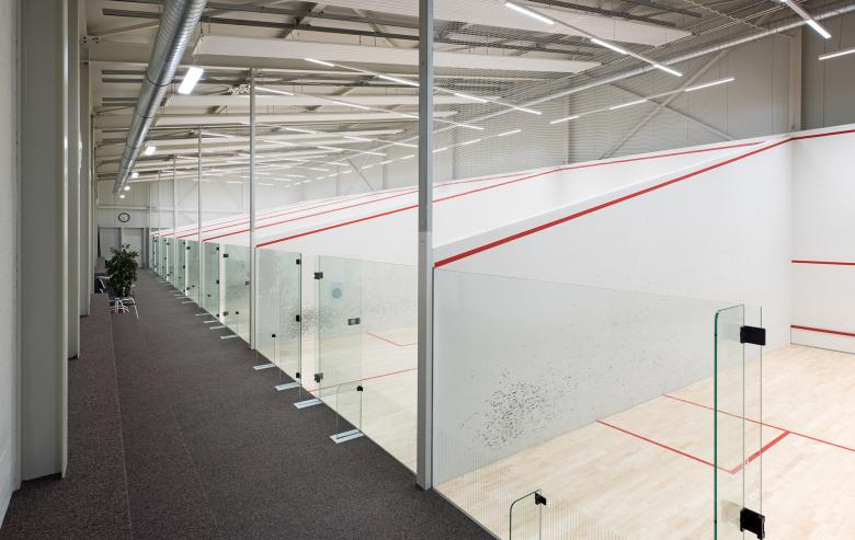 Das Anlagegefüge setzt sich aus drei Volumen zusammen: aus einer Tennis- und einer Squashhalle und einem Mitteltrakt. Die Tennishalle ist mit einem Steildach ausgebildet und umfasst sieben Plätze. Sie überragt die Squashhalle mit Pultdach. In dieser etwas kleineren Halle stehen sechs Plätze zur Verfügung. Sie bildet den westlichen Abschluss des langgezogenen Gebäudekomplexes, an den die grosse baumbewachsene Parkplatzfläche anschliesst. Im selben Volumen sind auch ein Fitnessbereich und eine Physiopraxis untergebracht. Zwischen den beiden Hallen funktioniert der Mitteltrakt als Scharnier. Er dient dem Empfang und dem Aufenthalt, umfasst Büro-, Garderoben-, Toiletten- und Lagerräume, den Technikraum sowie ein SportBistro.