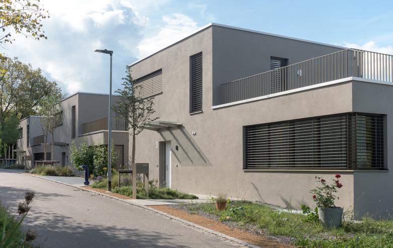 Die kompakte Bauweise ermöglicht es, Boden und Ressourcen einzusparen: So erfolgt beispielsweise die Erzeugung von Wärme und Warmwasser über eine zentrale Luft-Wasser-Wärmepumpe. Zugleich bietet die Siedlung mit ihren eigenständigen Häusern hohen Wohnkomfort und viel Autonomie: Alle Häuser verfügen über einen eigenen Gartensitzplatz, einen gedeckten Aussenbereich und bis zu zwei Dachterrassen. Im Prinzip vereint also das Ensemble die Vorzüge einer Terrassenhaussiedlung mit jenen des Einfamilienhauses.