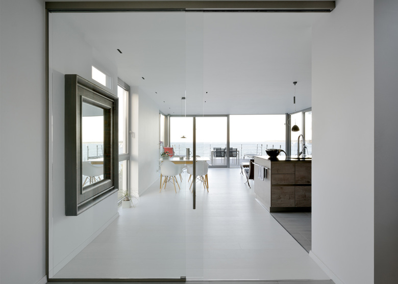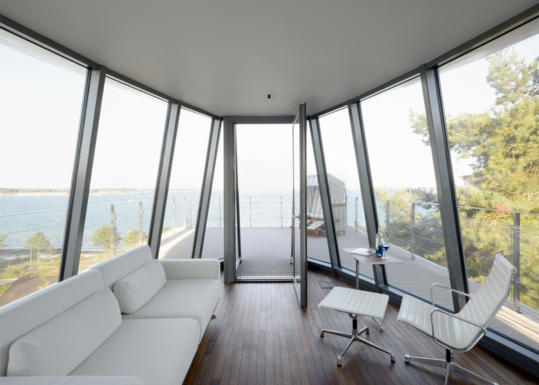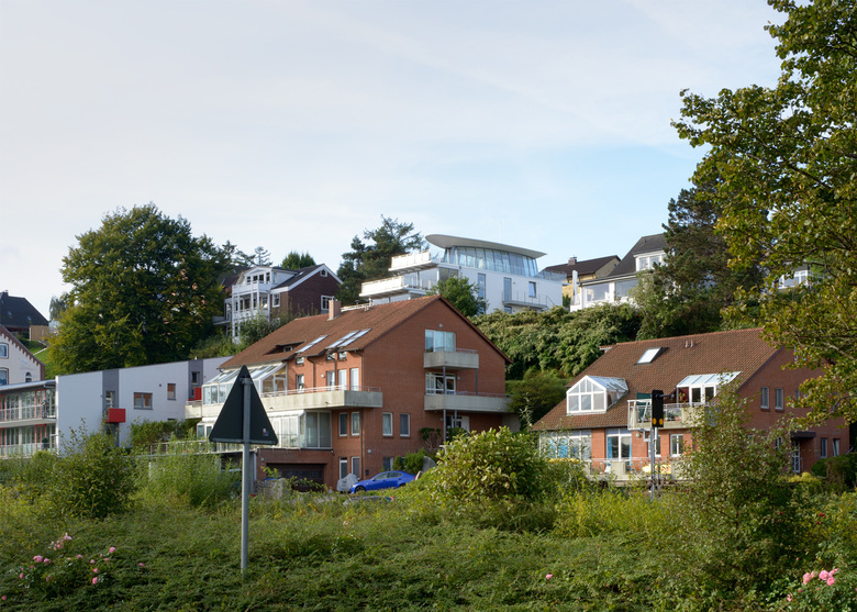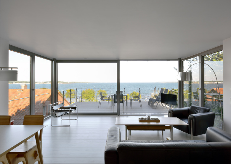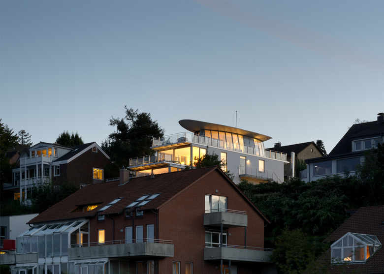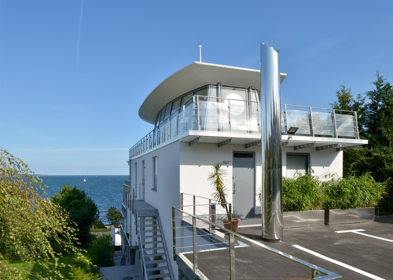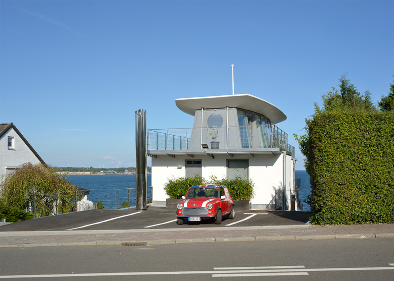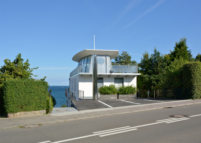 Durch die komplette Verglasung der Ostfassade sowie der angrenzenden Fassaden, wurde ein nahtloser Übergang zwischen Innen und Außen erreicht. Die „Kommandobrücke“ an oberster Stelle des Gebäudes mit dem dreidimensional geschwungenen Dach prägt die Gestalt des Gebäudes in besonderer Weise und nimmt Bezug auf die maritime Umgebung. Die Schiffsgeländer der Terrassen unterstreichen den gewollten maritimen Bezug.