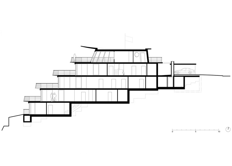Es war deshalb naheliegend ein Gebäude zu entwerfen, das sich terrassenartig dem Hang folgend nach Osten hin öffnet. Die jeweils vorgelagerten Terrassen haben vorspringende Vordächer, die den Einblick von den darunterliegenden Terrassen verhindern und so ausreichende Privatsphäre gewährleisten. Durch die Spannweite der Decken über die Hausbreite konnten die Innenräume individuell gestaltet werden.