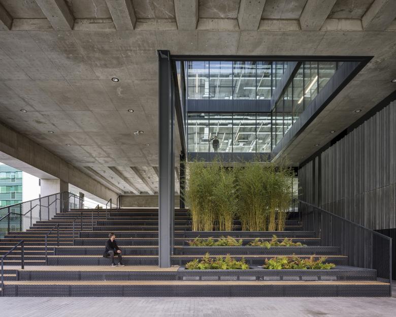 La definición de una línea estructural perimetral en coordinación con la fachada y el uso de forjados postesados, permite obtener un esquema funcional de planta libre en zonas de trabajo, aportando versatilidad funcional.