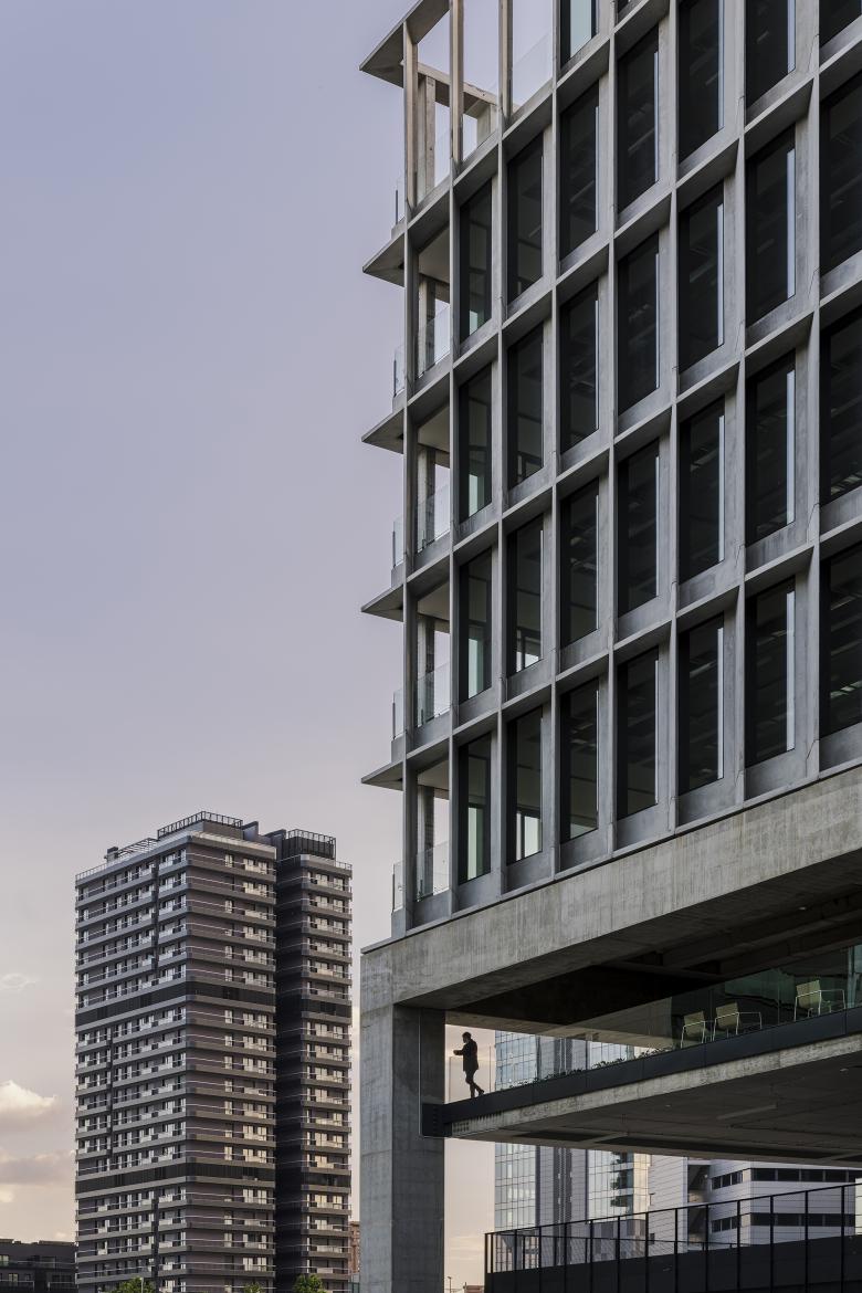 La fachada es modular prefabricada y queda definida por elementos estructurales que se adaptan a las distintas orientaciones solares, optimizando su rendimiento energético global y el grado de confort necesario para la puesta en valor de la edificación.